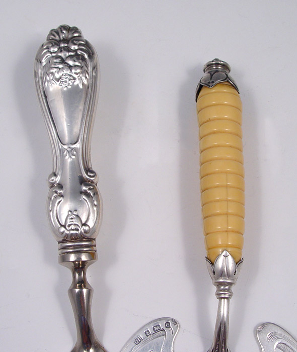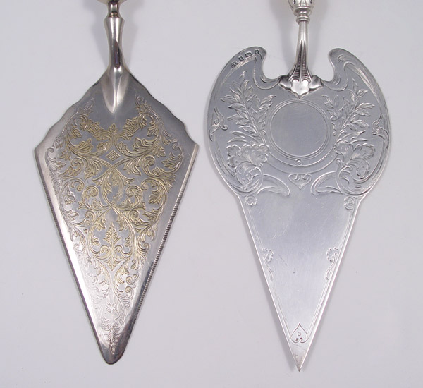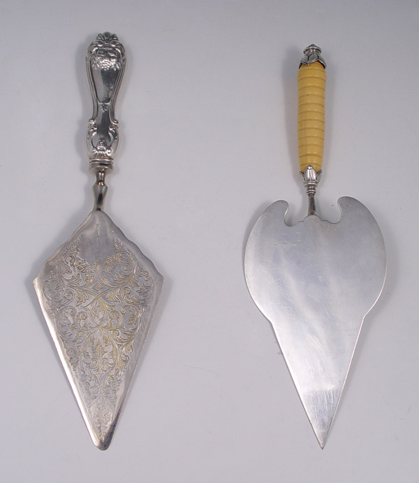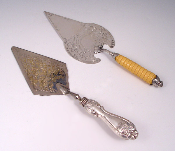 2 STERLING PIE / CAKE SERVERS: To include 1) George Unite, 1904 Birmingham hallmarked with sterling blade, pommel and ivory appearance handle. Engraved design on blade. 11 1/4'' l. x 3 5/8'' wide. 2) Raimond sterling handle with silverplate blade. Engraved design. 11 1/2'' l. x 3 1/4'' w.