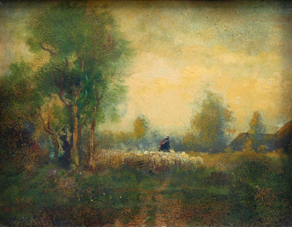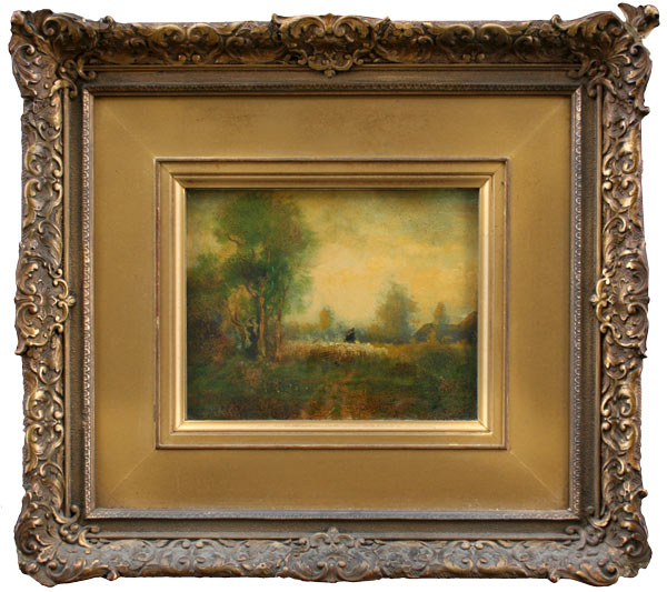 KITCHELL, Hudson Mindell, (American, 1862-1944): Sheepherder and Flock in a Tonalist Landscape with Village Ahead, OIL/Board, 7 1/4'' x 9 1/2'', incised signature, carved and gilded gesso frame with minor wear, damage to corner, 16'' x 19''. Est. $800/1200**