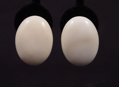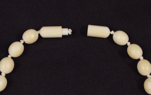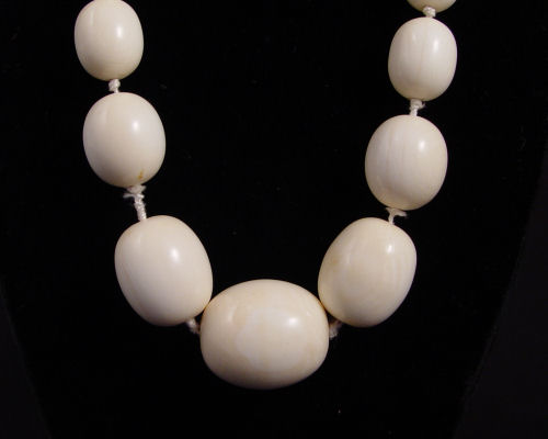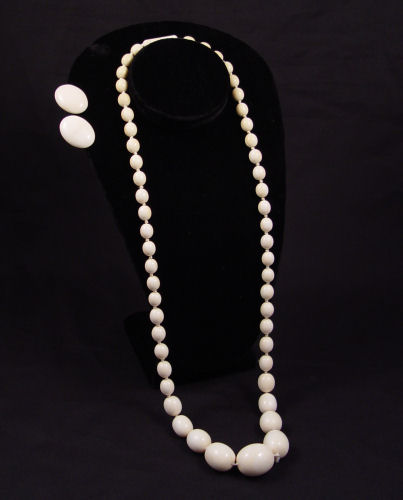 IVORY BEAD NECKLACE AND EARRINGS: 33'' strand of graduated ivory beads with ivory screw clasp. Sold with ivory oval disc earrings. The earrings are clip on style, 1 1/4''.