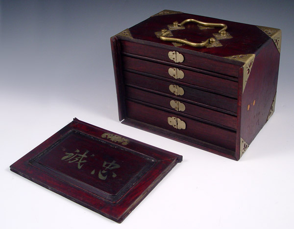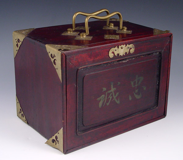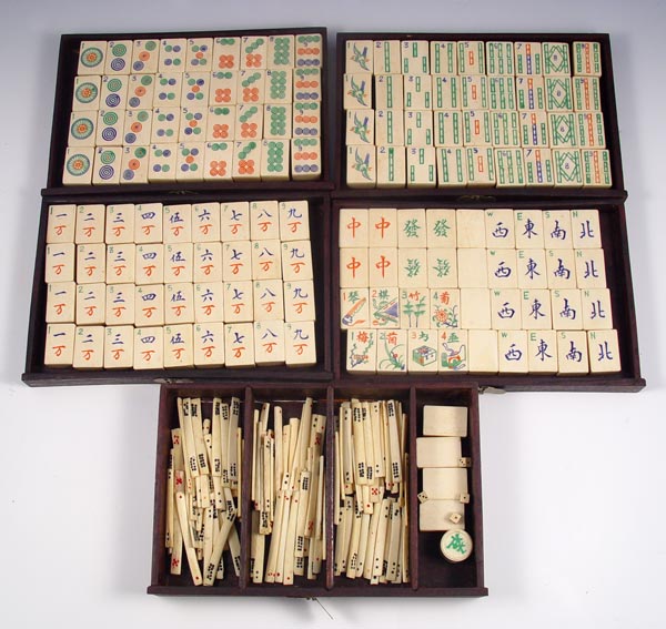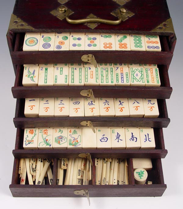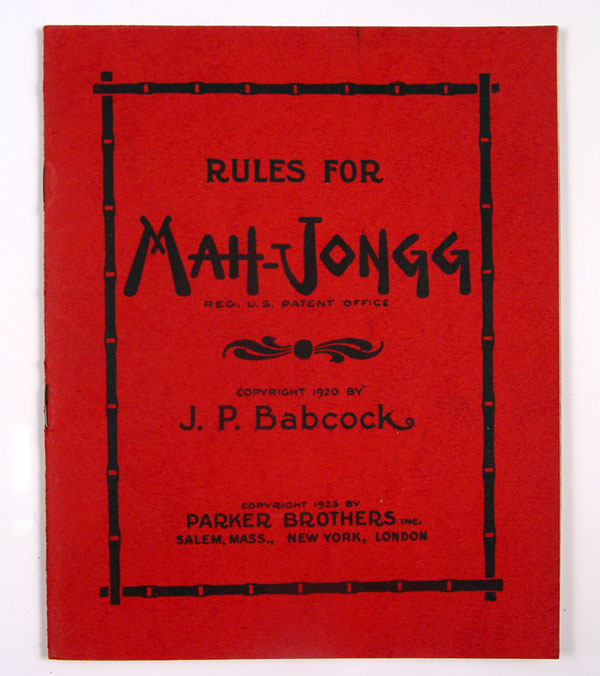 MAH JONG GAME SET AND BOX: Form of the ancient Chinese game adapted by J.P. Babcock. Sold with the rule booklet. Box is 6 5/8'' x 6 1/2'' x 8 1/4''.