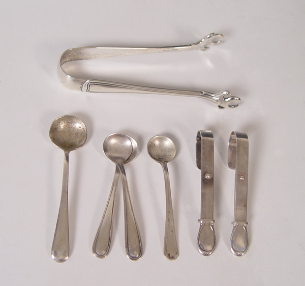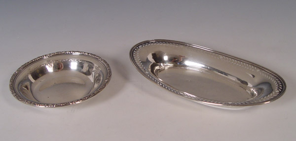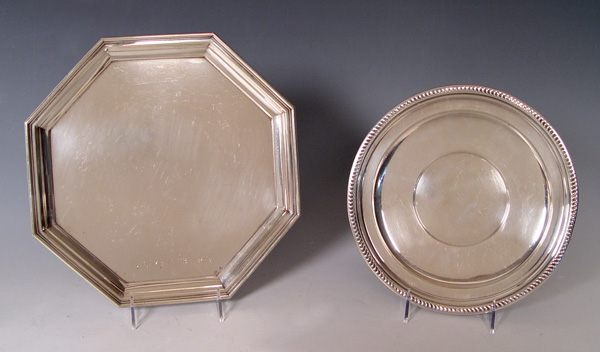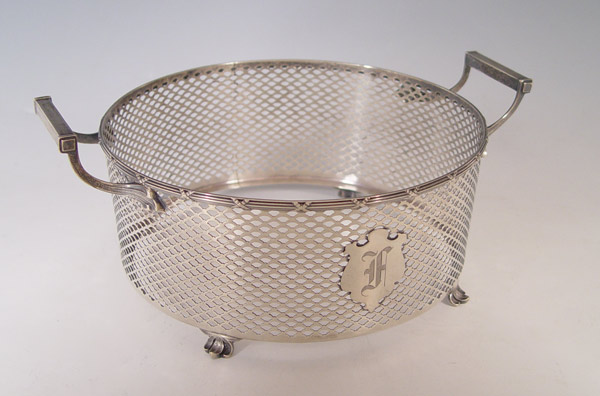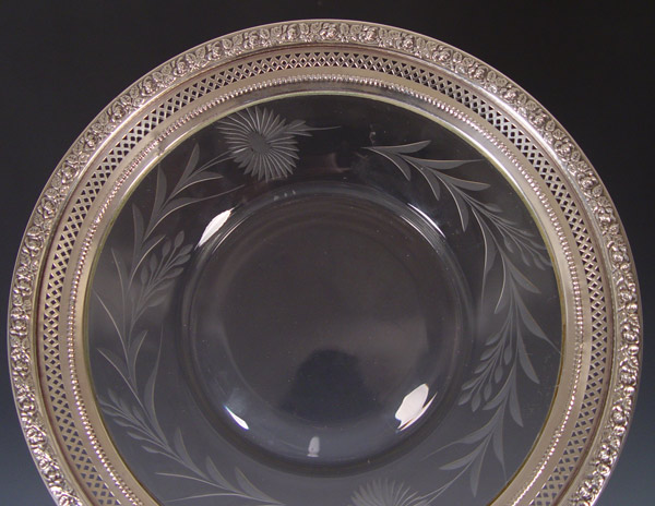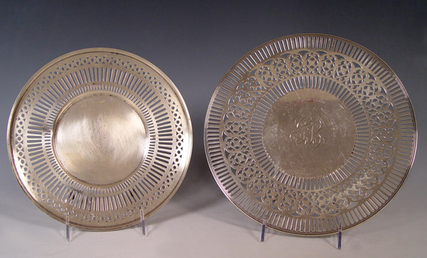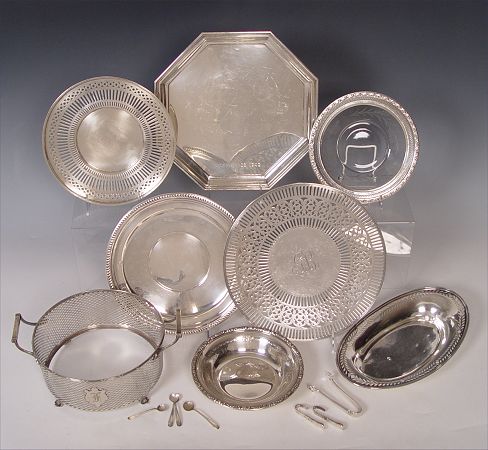 ESTATE STERLING COLLECTION RETICULATED SERVERS & MORE: To include 1) Gorham octagonal tray, Etched date December 28th 1949, 11 1/2'' dia.. 2) Gorham reticulated rim dish, 1914 date mark, 9 3/4'' dia. 3) Wallace vegetable server, reticulated rim, monogrammed, note dings. 12'' x 6 1/4''. Gorham reticulated tray, monogrammed, 11'' dia. 4) Meriden 2 handled openwork basket, missing insert, monogrammed, 4 3/8'' h x 10 1/2'' w. overall. 5) Towle dish with repousse rim, 1 1/4'' h. x 7 1/4'' dia. 6) Unmarked tray with rope twist rim, 10'' dia. 7) Wallace silver mounted dish, etched glass interior, 8'' dia., note dings. 8) 4 silver salt spoons, Gorham sugar tongs, 2 Sorenson Danish, place holders. Approx 75.9 troy oz.