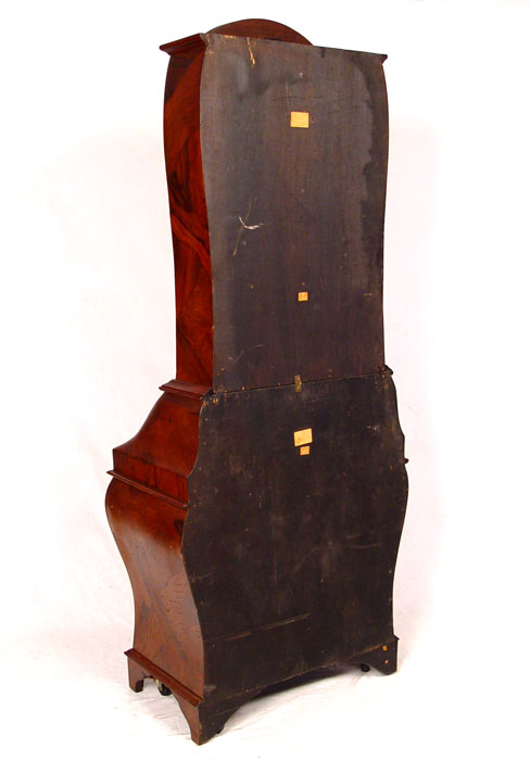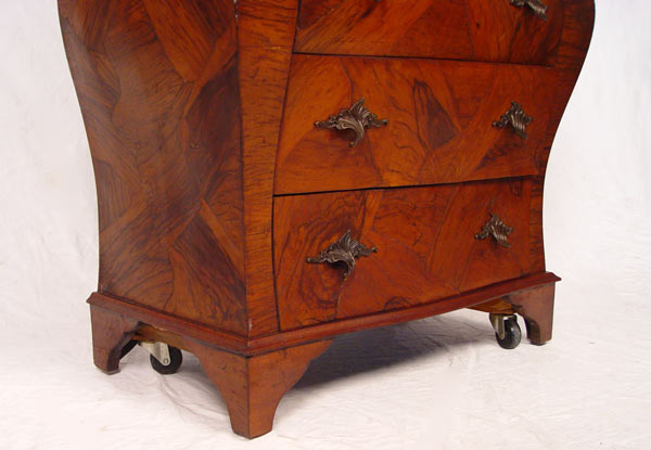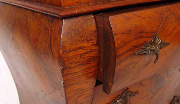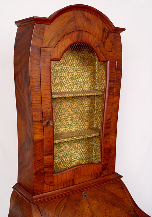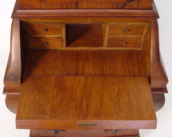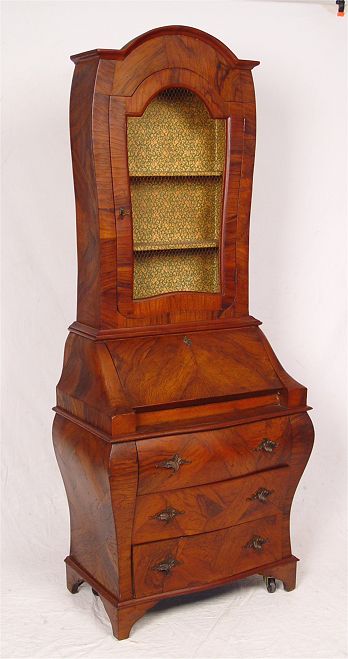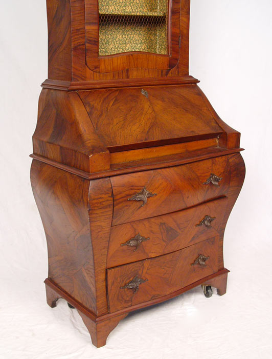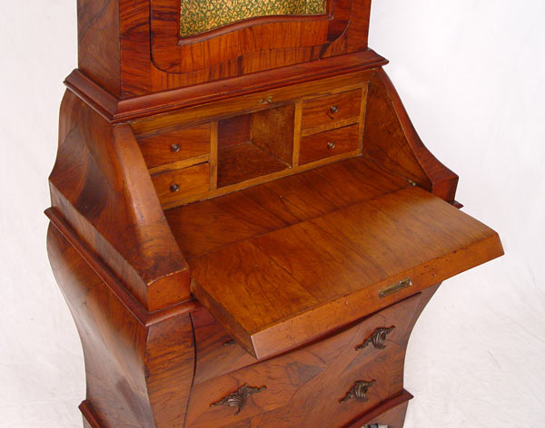 ITALIAN BURL VENEER BOMBAY SECRETARY: Single door bookcase top with Italian papered interior with wire in door frame. Drop front desk with 4 drawer interior, over 3 drawers with bronze pulls. 72'' h. x 28'' x 16''.