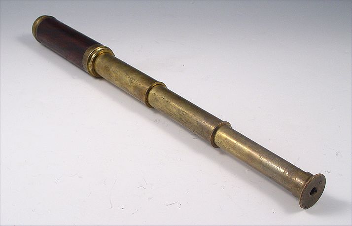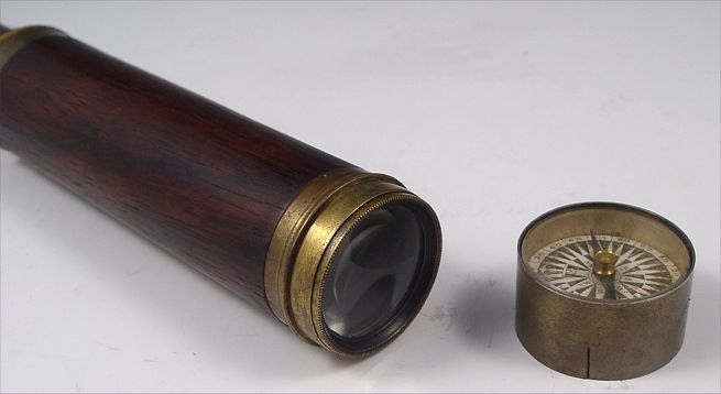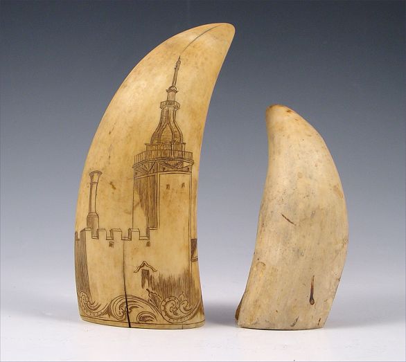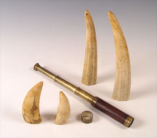 5 NAUTICAL COLLECTION, SCRIMSHAW, TUSKS, TELESCOPE: Includes 1) Sperm whale tooth with scrimshaw of buildings, scroll work at base. 5 7/8'' long. 2) Sperm whale tooth, 3 7/8''. 3) Walrus tusk 11 1/4'' long, note hole at tip. 4) Walrus tusk, 12'' long. 5) Brass & wood ships telescope, unmarked as to maker. Compass on lens cap. 17 1/8'' long fully open, 6 1/2'' closed.