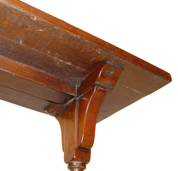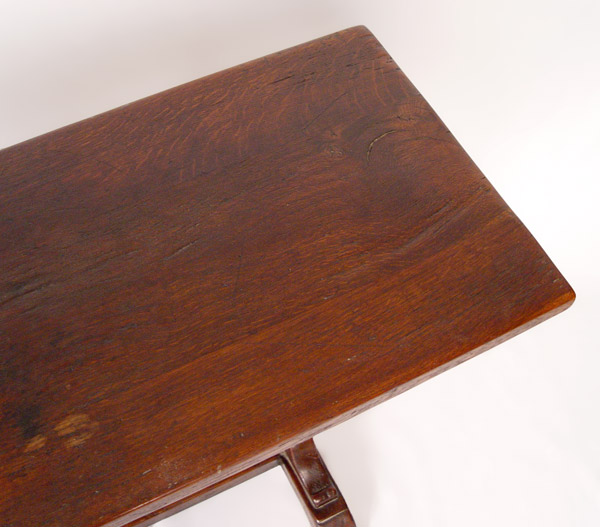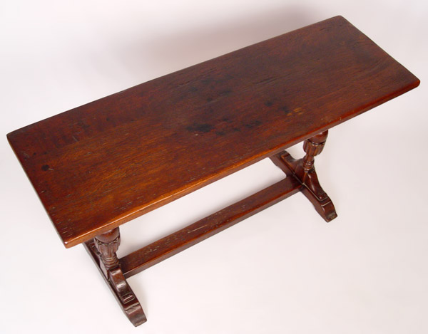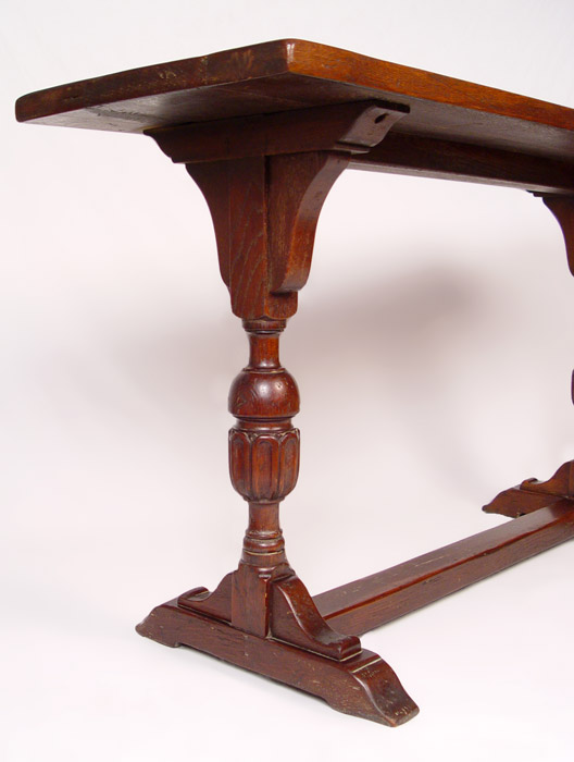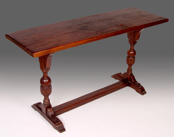 LATE ELIZABETHAN TRESTLE TABLE: Oak plank top over ovoid baluster supports with trestle, raised shoe feet. 29'' tall x 54'' x 18''.
