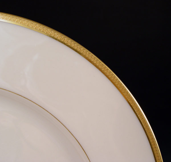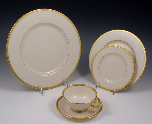 LENOX FINE GOLD RIM CHINA IN THE WINDSOR PATTERN: 58 pieces to include 11 dinner plates, 12 salad plates, 11 bread plates, 12 cups and 12 saucers.