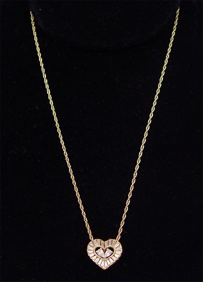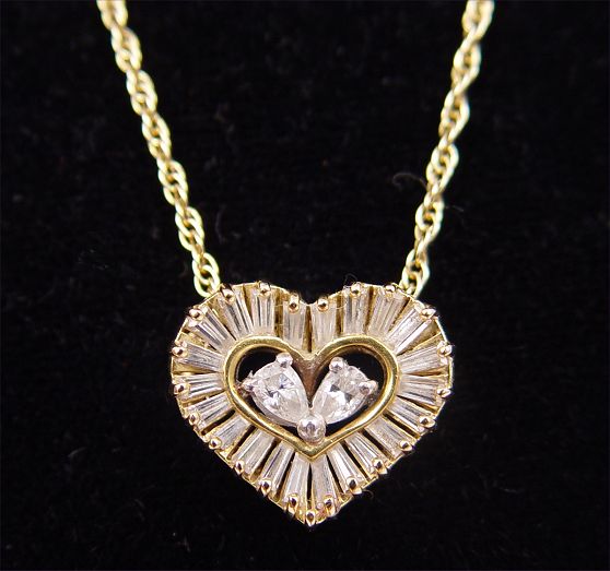 DIAMOND HEART PENDANT: 14K yellow gold heart pendant contains two pear cut diamonds and 22 baguette cut diamonds. WEIGHT: 1.00 Ct. Approx. The diamonds average VS in clarity and G-H in color. The diamonds are prong set. 14K yellow gold 16'' fine rope chain. Weight: 5.0 grams