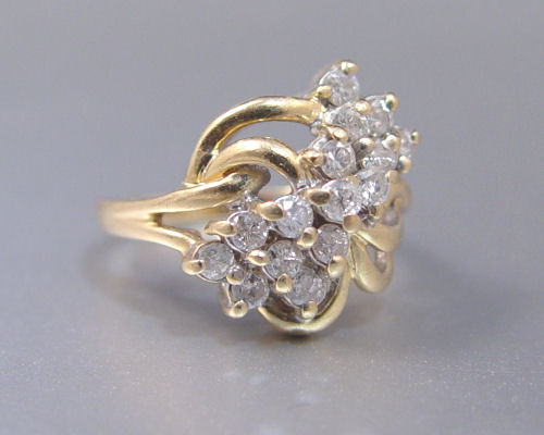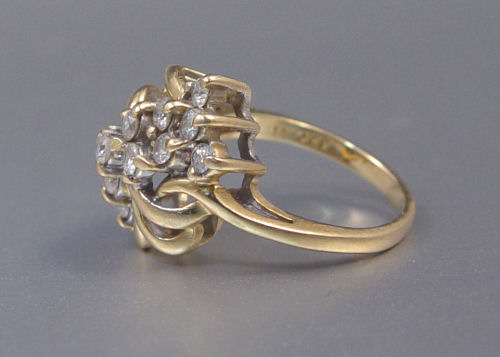 DIAMOND COCKTAIL RING: 14K yellow gold ring contains fifteen round brilliant cut diamonds. WEIGHT: .33 Ct. Approx. Rated I1 in clarity and I-J in color. The diamonds are prong set. Size 2.5, Weight. 3.5 grams.