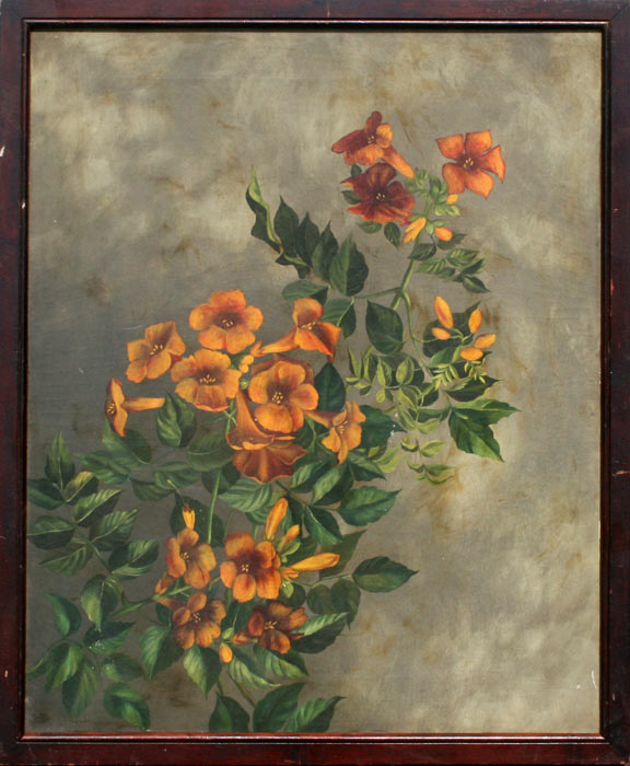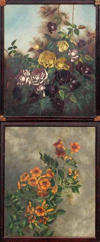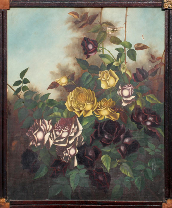 LATE NINETEENTH - EARLY TWENTIETH CENTURY TWO SIDED OIL DEPICTING FLOWERING VINES AND ROSE THICKET: In the style of Lambdin, sight size 26 1/2'' x 21 1/2'', framed, 29'' x 23 3/4''.