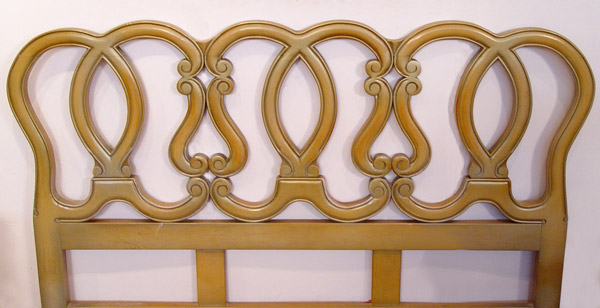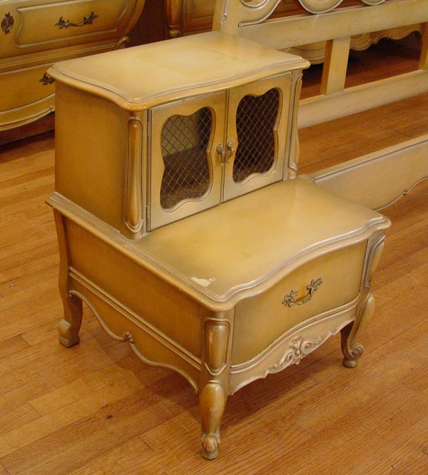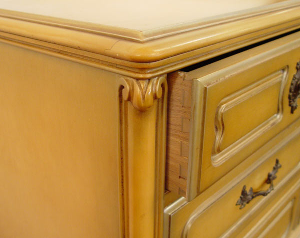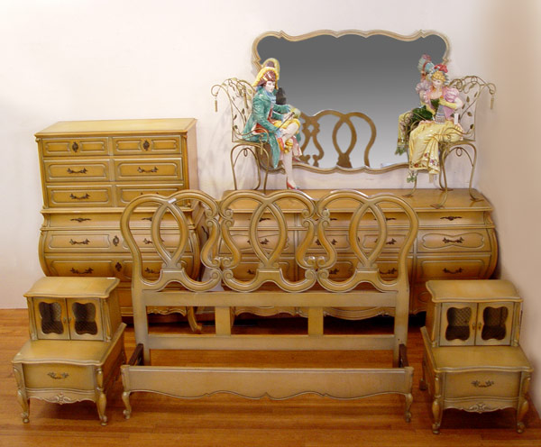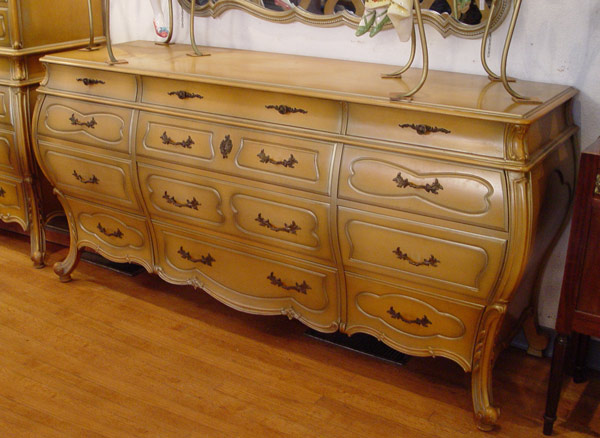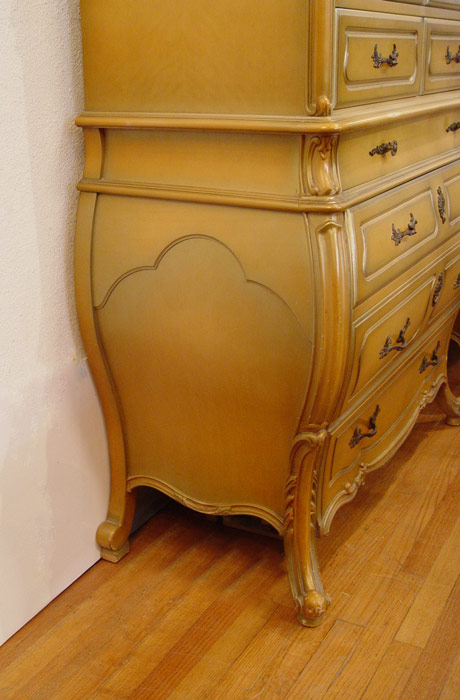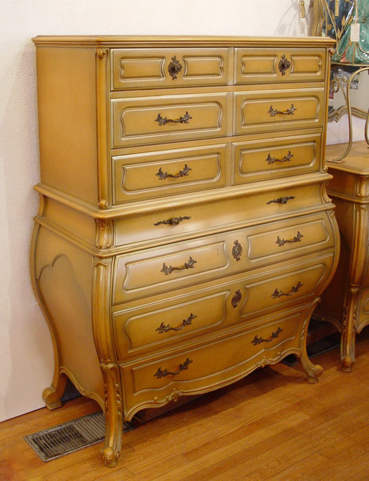 6 PIECE FRENCH STYLE BOMBAY BEDROOM SET BY DAVID JONES Inc, NY: Two tone butterscotch colored Bombay French style set to include 1) CHEST ON CHEST, 3 over 4 drawers, 57'' tall x 45 1/2'' x 20 1/2''. 2) A 12 drawer credenza style DRESSER, 36'' x 75'' x 23''. 3) Cut ribbon HEADBOARD, 48'' tall x 63''. 4) Pair step style NIGHTSTANDS. 5) Added later to the set is a sculpted edge oblong MIRROR.