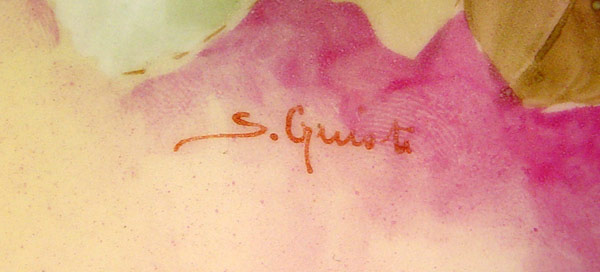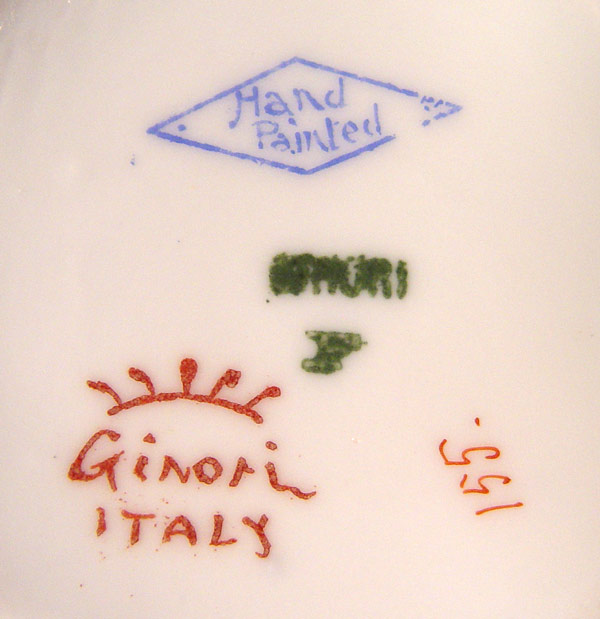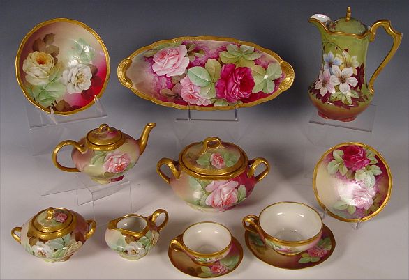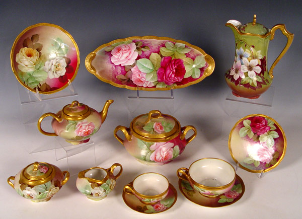 ROSE DECORATED HAND PAINTED FIRENZE ITALIAN DESSERT SET: To include teapot, covered sugar, cream pitcher, 3 cups and saucers, 2 large cups and saucers, biscuit jar, and 14'' oval bowl. Also in this lot are 6 Ginori hand painted 6.5'' plates and a French Limoges chocolate pot.