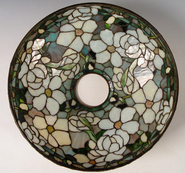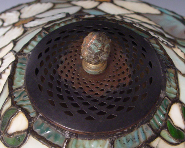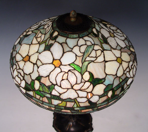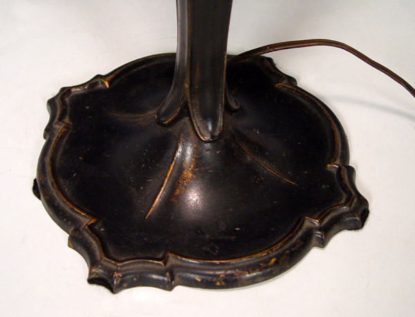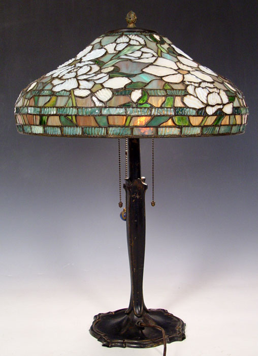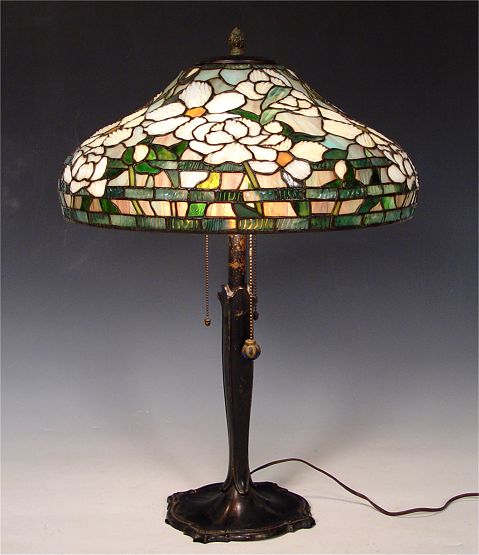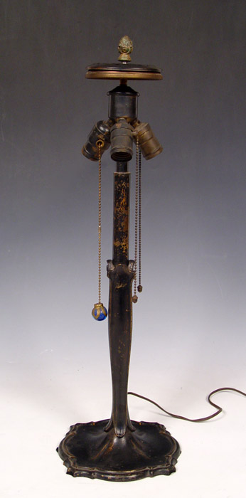 AN OLDER TIFFANY STYLE LAMP - FLORAL DESIGN SHADE: Extraordinarily good replication, the bronzed base with good wear. Three socket pull chains. The shade with pinecone finial. Shade is 18'' dia., the lamp is approx. 25'' tall overall.
