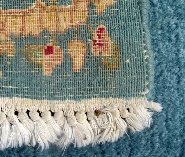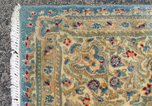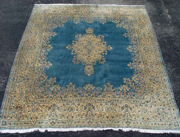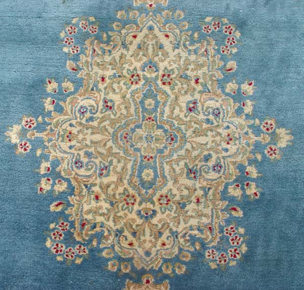 HAND TIED LIGHT BLUE KERMAN CARPET: Approx 11' 6'' x 9' 8''. Light blue ground with cream border, open field medallion. Ca. 2nd quarter 20th C.