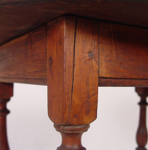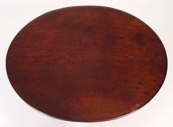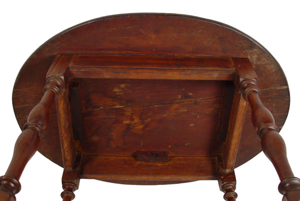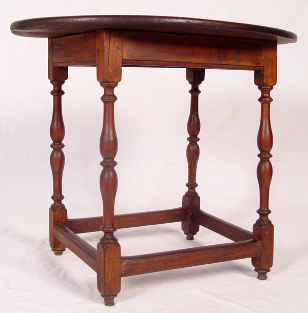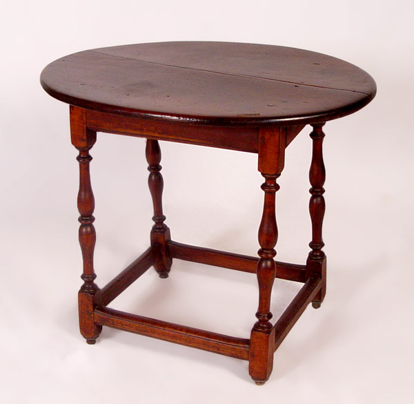 WILLIAM AND MARY OVAL TOP TAVERN TABLE: New England Ca. 1740, pegged construction, glue pegs intact, turned and splayed legs with stretcher base. 25'' tall x 30 1/4'' x 22 1/2''.