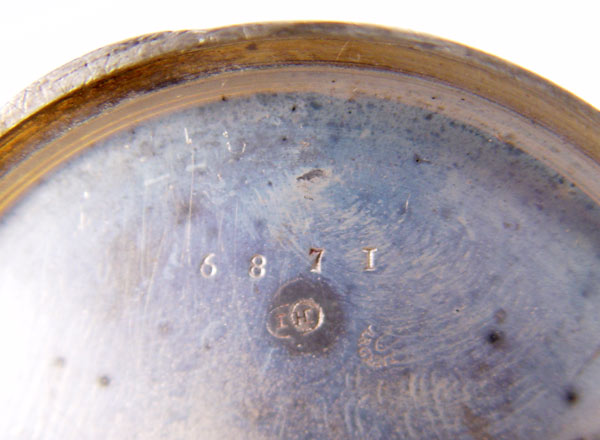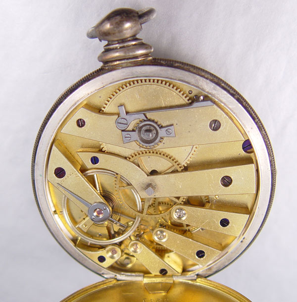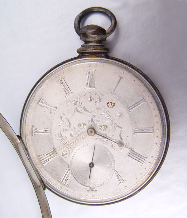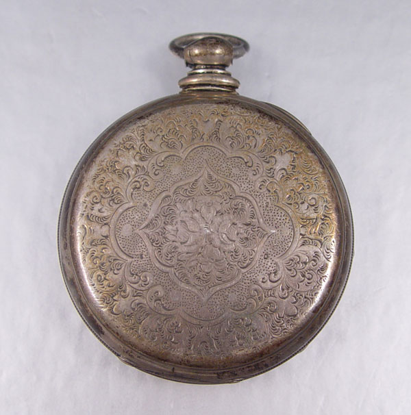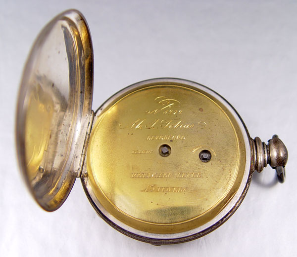 1870'S M. J. TOBIAS ENGLISH POCKET WATCH: Circa 1875 coin silver case with British hallmarks. Case back and dust cover have matching serial numbers of 5272. Movement is Swiss bar type, cylinder escapement. Signed M. Tobias, Liverpool, case is marked Argent with hallmarks. Silver dial with large Roman numerals. Bullseye crystal, most likely original to watch.