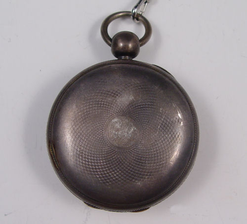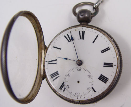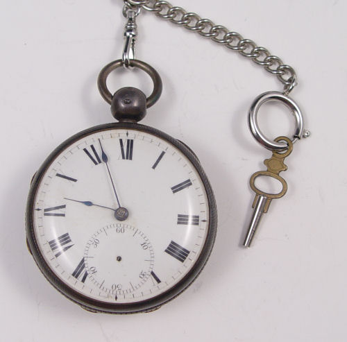 1850'S BRITISH SILVER POCKET WATCH: Approx. size 18 pocket watch with open face. Case test coin silver, 1818 Chester England hallmarks on case. Fusee watch movement, chain drive, dates approx 1850, singed Robert Roskell, Liverpool with serial number 29098. Case serial number matches movement. Dial has swing out hinge to view movement from front. Key wind, comes with chain and key.