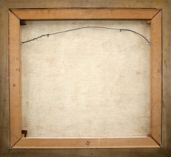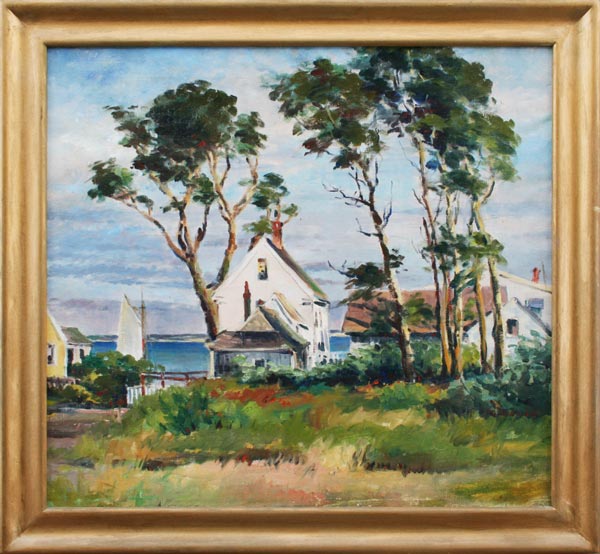 GOOD ROCKPORT SCHOOL? IMPRESSIONIST LANDSCAPE WITH COTTAGES ON THE BAY: OIL/Canvas, 20'' x 22'', no visible signature, painted wooden frame, 23 1/2'' x 25 1/4''.
