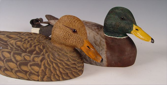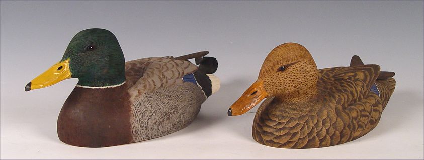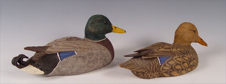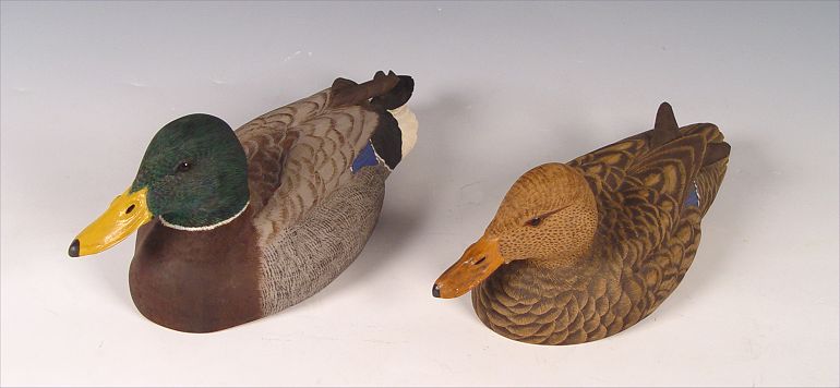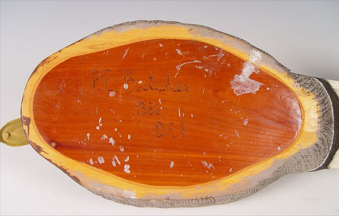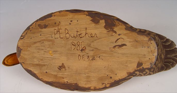 PAIR P. E. BUTCHER MALLARD DUCK CARVINGS: Drake and hen, Signed P. E. Butcher 1986 D. E. B.. Glass eyes, fine detail. Drake measures 6'' h. x 16'' x 6 3/4''.