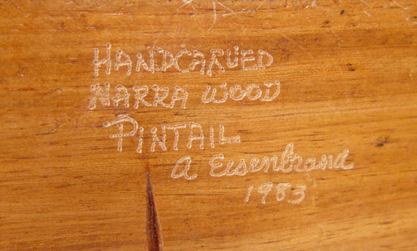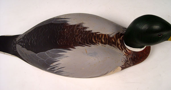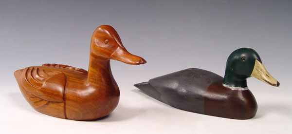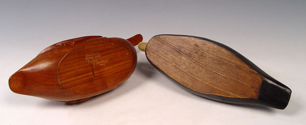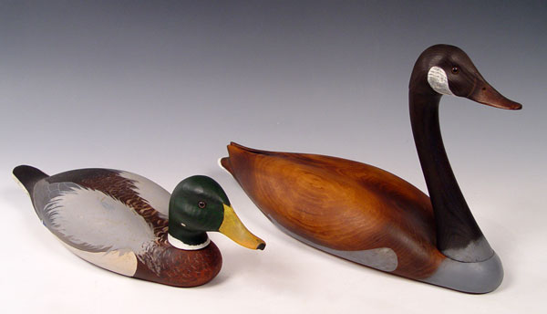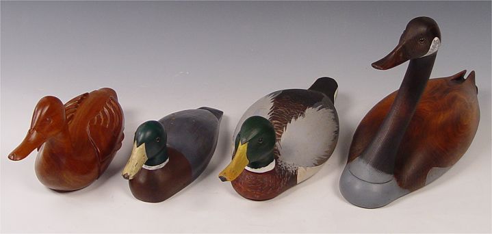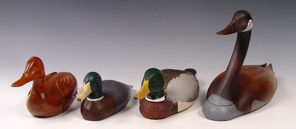 4 PIECE COLLECTION DECORATIVE DUCK / GOOSE DECOYS: To include 1) Canadian goose with articulated neck. Signed A. Hibbard. 12'' h. x 20'' x 7 1/2''. 2) Mallard drake with articulated neck. Signed A. Hibbard. 5 5/8'' h. x 19 1/4'' x 6 1/2''. Note foxing, paint scrapes. 3) Mallard drake. Signed G. Lowenthal 546 mallard drake. 5 1/4'' x 15'' x 4 3/4''. Note paint. 4) Unpainted duck. Signed Handcarved Narra Wood pintail A. Eisenbrand 1983. 7'' h x 15'' x 5 1/4''.