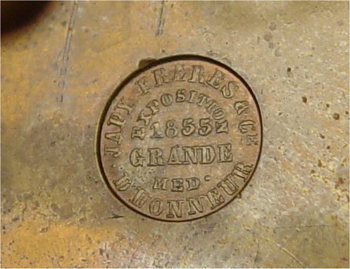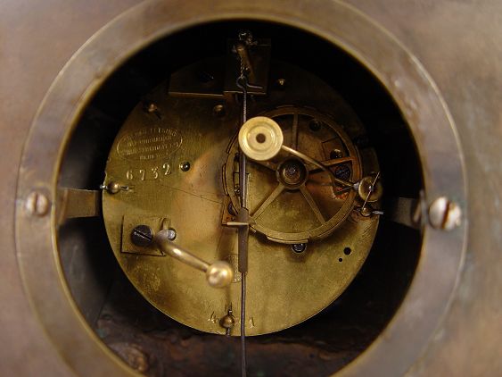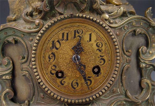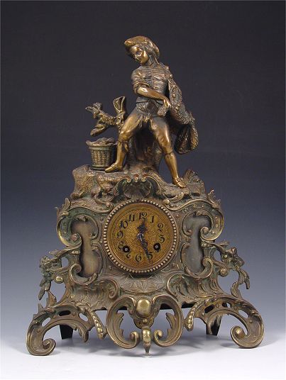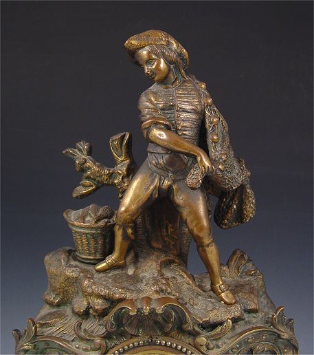 JAPY FRERES FRENCH BRONZED FIGURAL CLOCK: Bronzed spelter clock with figure of small boy with fishing net and basket of fish. Metal face with Arabic numerals. Key and pendulum mechanism marked with Japy Freres 1855 medallion. No key. Measures 16'' h. x 12'' x 5''.