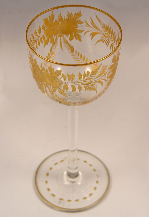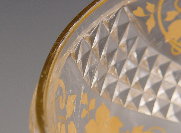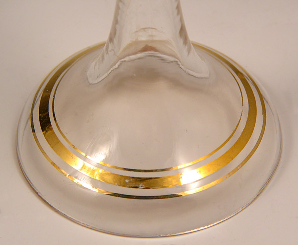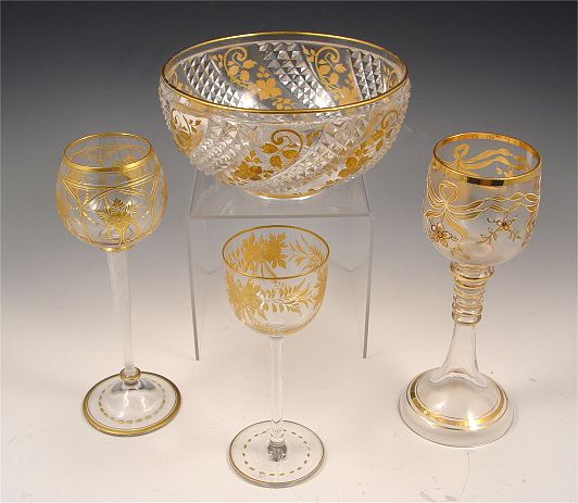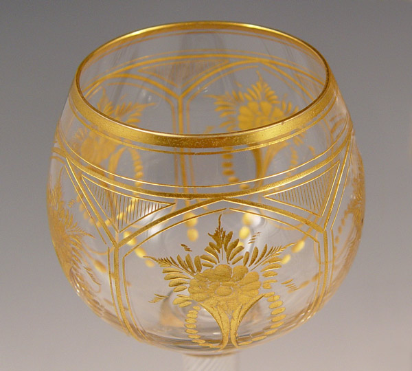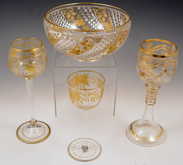 BACCARAT GOLD DECORATED GLASS BOWL: Signed in raised letters, 3''h. x 7'' dia. Sold with a group of 3 gilt and etched wine stems.