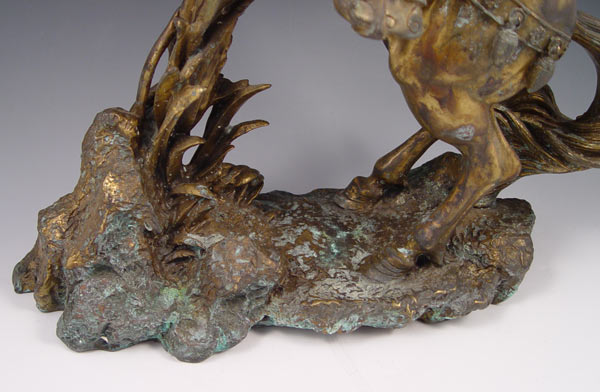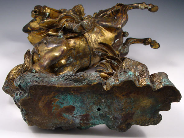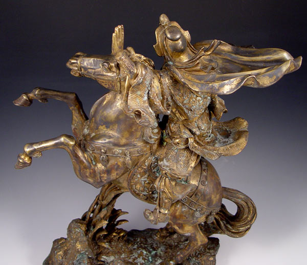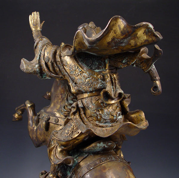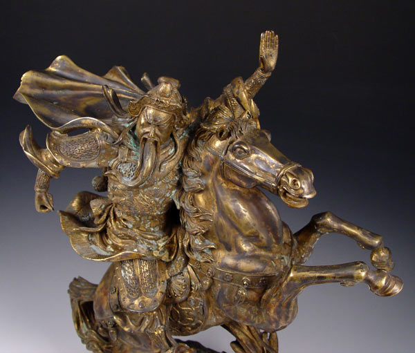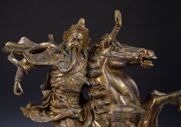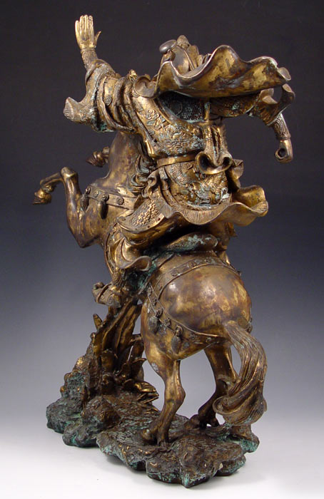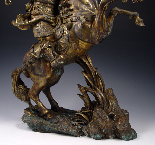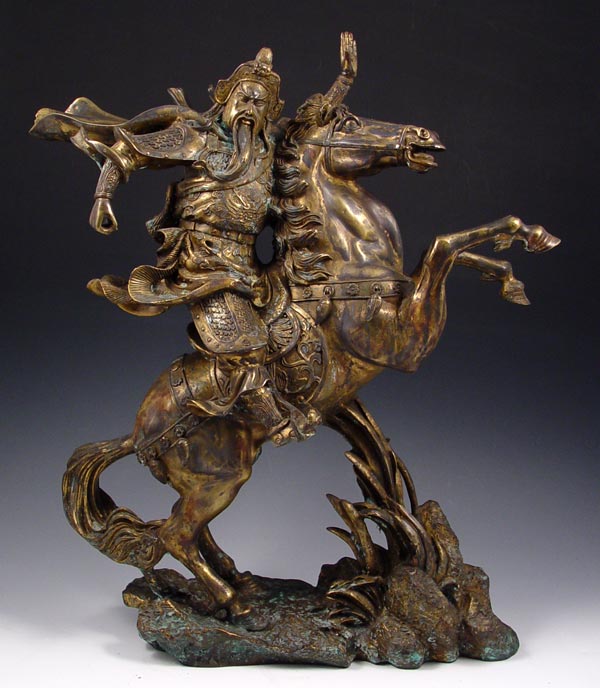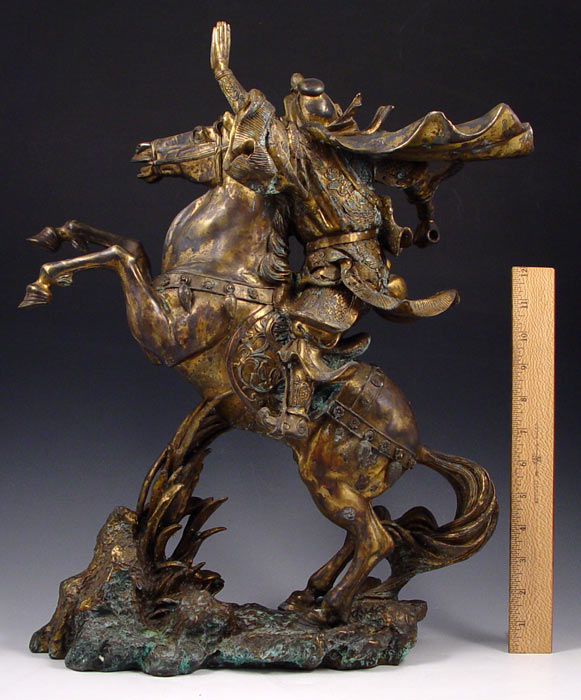 DECORATIVE CHINESE BRONZE STATUE OF GENERAL GUAN GONG: on horseback, 19''h. x 13''.