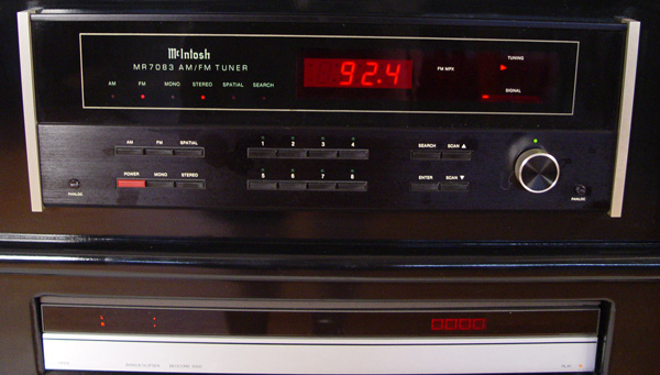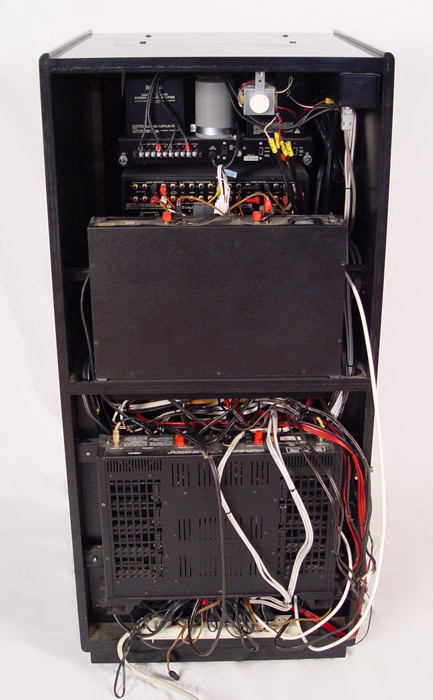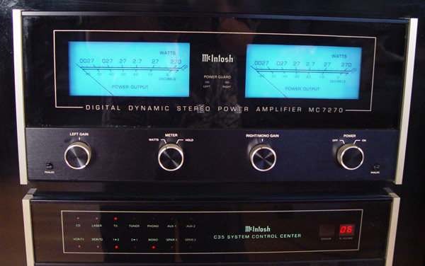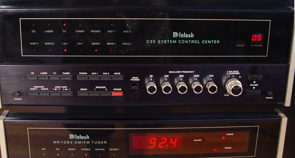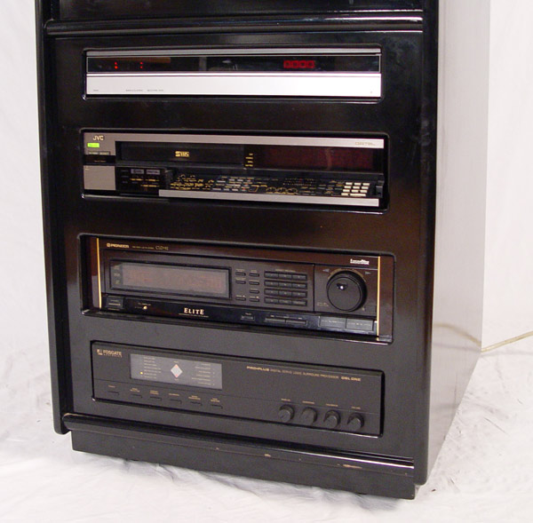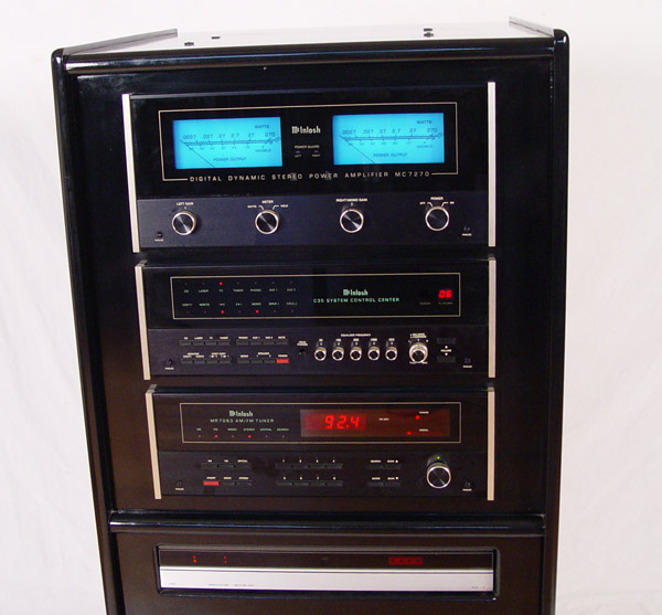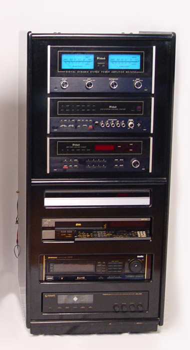 CUSTOM MCINTOSH SOUND SYSTEM: Complete system in custom made stand to include 1) McIntosh MC 7270 Amplifier. 2) McIntosh C 35 control center. 3) McIntosh MR 7083 AM/FM Tuner. Stand also has 4) Bang & Olufsen Beocord 500 tape deck. Front appears to be stuck in closed position. 5) JVC Super VHS player / recorder. 6) Pioneer CLD 92 CD player. 7) Pro Plus DSL One Servo Logic Surround Processor. 8) SAE AZ 201 Amplifier. Stand measures 49 1/4'' high x 22 1/2'' x 24''