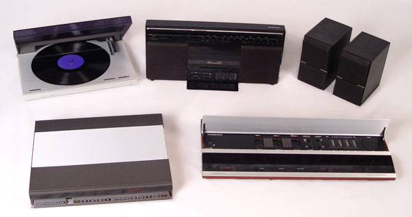 6 PIECE COLLECTION OF BANG & OLUFSEN COMPONENTS: Includes 1) Beomaster 2400 tuner / amplifier. 2) Beomaster 5000 tuner / amplifier. 3) Beosystem 10 portable radio with tape deck. 4) Beogram 5005 turntable. 5) Pair of Beovox CX50 speakers.
