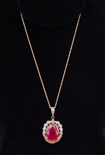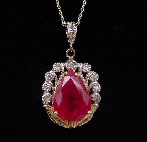 17.27 RUBY PENDANT: 14K yellow gold pendant contains one pear shaped mixed cut ruby, approx. weight of 17.27 Ct. The ruby is clarity and color enhanced. Twelve round full cut diamonds. Weight: .44 Ct. Approx. Rated I1-I2 in clarity and J-K in color. The ruby and diamonds are prong set. 14K yellow gold 16'' fine rope chain. Weight: 10.9 grams.