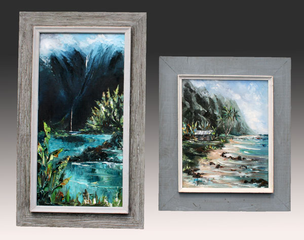 PAIR OF ILLEGIBLY SIGNED OIL/CANVAS HAWAII LANDSCAPES: One depicting a coastal scene w/ village, 20'' x 16'', barnwood painted frame, 26'' x 24''. The other scene depicts an island waterfall w/ stream, 30'' x 15'', encased in barnwood painted frame, 37'' x 22''. Est. $300/500**