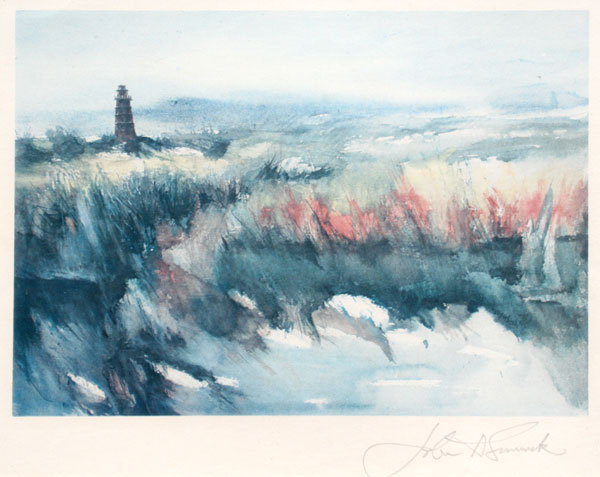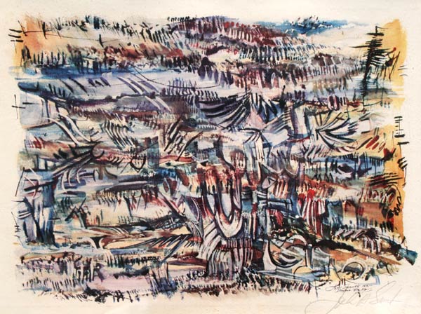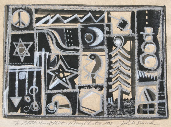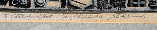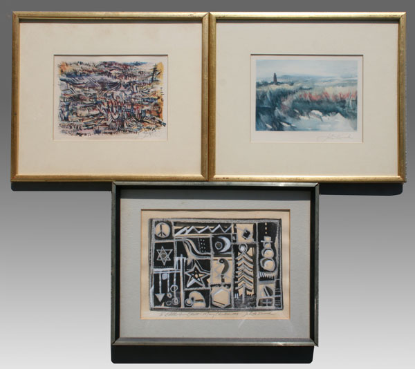 SUROVEK, John H., (American, 20th C.): 3 piece art lot; Gouache on Paper, abstract geometric, sight size 8'' x 10 3/4'', pencil signed lower right, dedicated to Edith and Elliot, ''Merry Christmas'', 1973, wood and metal frame, 12'' x 15''; Offset lithograph of Whitehouse, sight size 8 1/2'' x 8 1/4'', pencil signed lower right, gilded frame with minor wear, 12 1/2'' x 14 1/4''; Offset Lithograph of Abstract Landscape, sight size 6 1/2'' x 8 1/4'', pencil signed on the lower right, gilded frame with wear, 12 3/4'' x 14 1/2''.