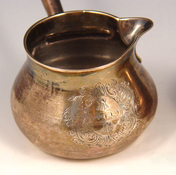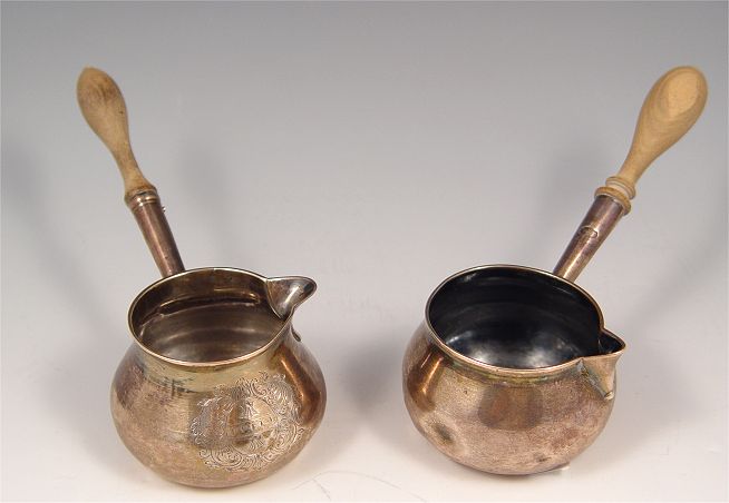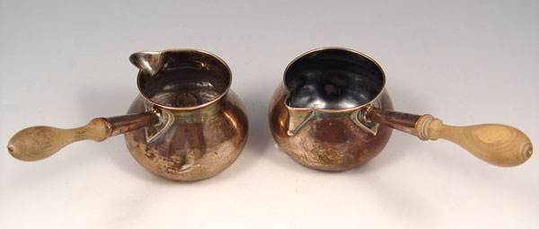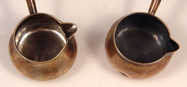 2 PIECE EARLY 19TH C. ENGLISH STERLING SAUCE LADLES: To include 1) 1806 London William Fountain? hallmarked with wood handle. 3'' h. x 6 1/4'' l. 2) 1813 London, unknown maker hallmarked with wood handle, engraved design. 3 1/8'' h x 6'' l.