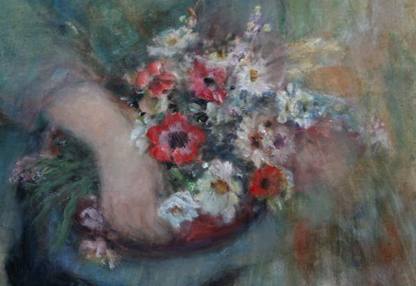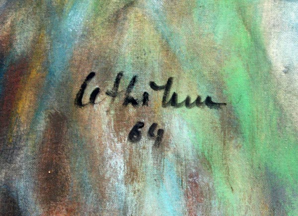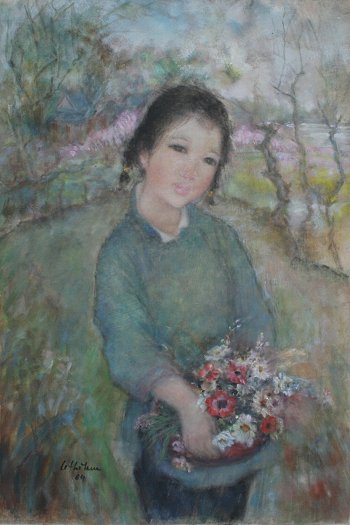 LE THI LUU, (Vietnamese, 1911-1988): Smiling Girl with Flowers in a Landscape, Oil/Silk, 16'' x 11'', signed lower left and dated from 1964, framed. Original receipt from J. Le Chapelin, Paris, 1965. Est. $10000/12000**