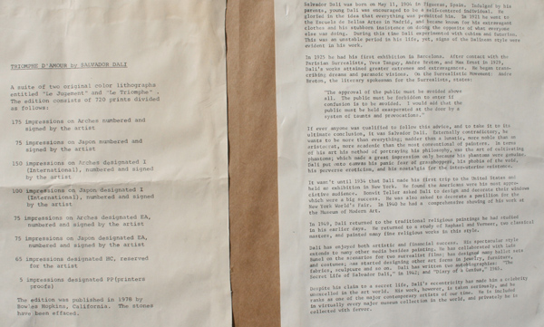 DALI, Salvador, (Spanish, 1904-1989): ''Triomphe D' Amour'', Lithograph, sight size 27 1/2'' x 20'', pencil signed lower right labeled I V/CL, framed, 36 1/2'' x 28'', sold with original receipt from Merrill Chase Galleries. Est. $400/600**
