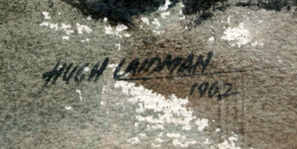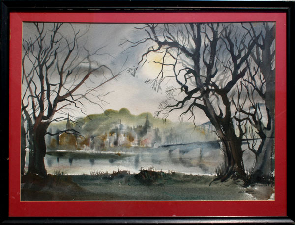 LAIDMAN, Hugh, (American, 1914-1987): Misty Bridge with City in Distance, Watercolor, signed, framed.