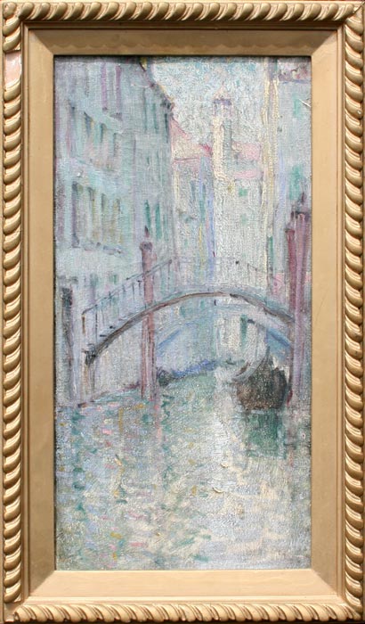 IMPRESSIONIST VENETIAN CANAL SCENE: OIL/Canvas, 17 1/2'' x 9 1/8'', encased in gilded and carved gesso lining with overpaint, 20 1/2'' x 12''. Est. $800/1200**