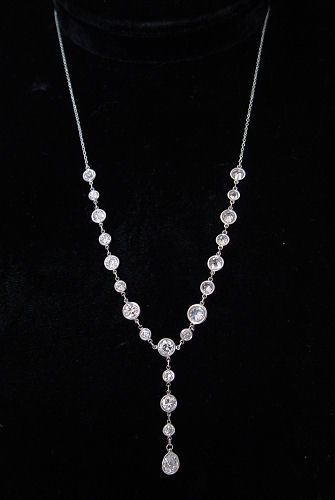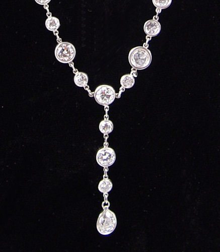 PLATINUM & 4.17 CT DIAMOND ''Y'' NECKLACE: Hand crafted platinum necklace featuring an approx. .59 Ct pear shaped diamond, rated SI1 in clarity and I-J color. There are also 20 Old European round and transitional round cut diamonds, approx. 3.58 Ctw, averaging SVS-SI in clarity and H-I-J in color. All diamonds are bezel set. The chain is 8'', the dangle is an additional 1 3/8''. Total diamond weight is approx. 4.17 Ct., Weight 6.3 grams. Sold with current Florida Diamond Appraisers GIA graduate's appraisal for $12,350. Est. $6000/12350**