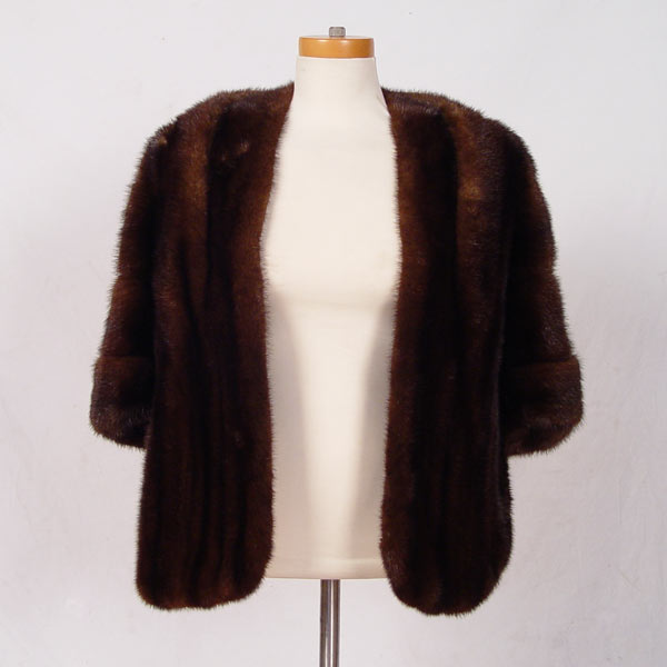 DARK BROWN MINK CAPE: Short cape with nice detail of raised pelt along the collar. Menchel's Furs of Albany NY label. Approx. 23'' long.