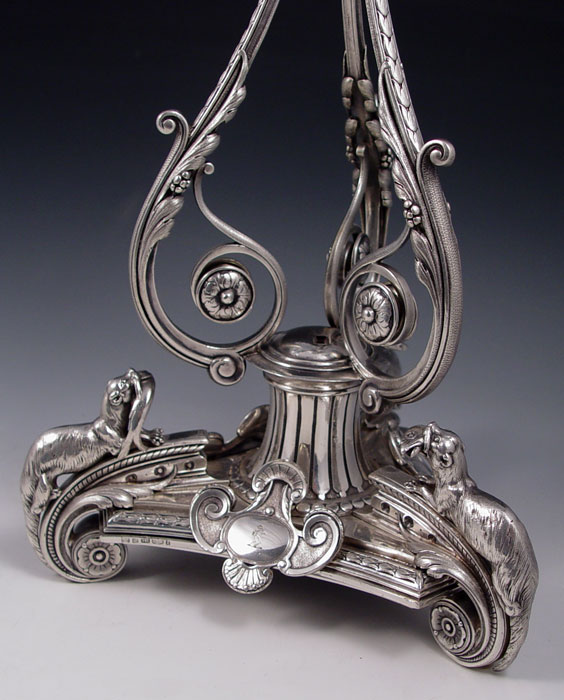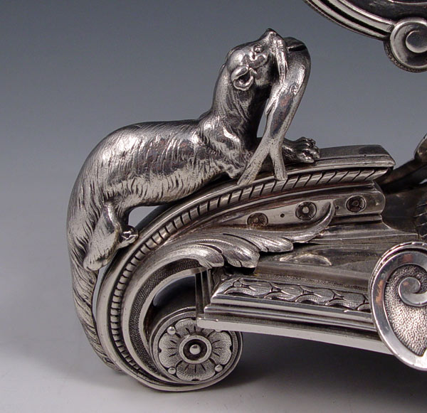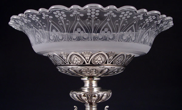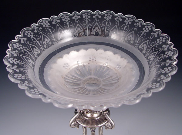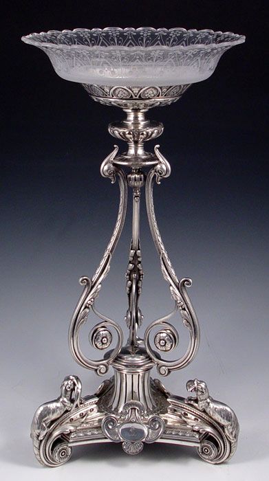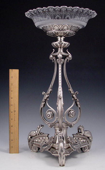 ELKINGTON OTTER FIGURAL SILVERPLATE CENTERPIECE: Foliate scroll with 3 otters and figural bird heads. Well marked with Elkington & Co. marks. Etched glass bowl may be later. Measures 17 3/4'' h. x 9'' base dia.. Bowl measures 2 7/8'' x 9 7/8'' dia. Est. $800/1200**