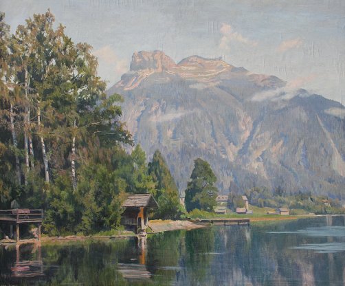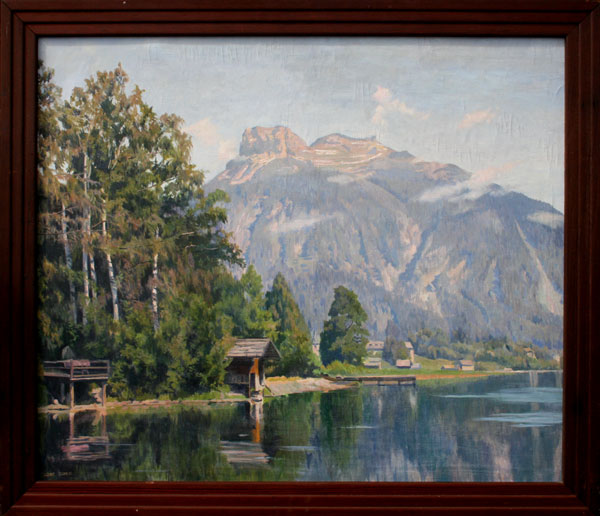 SCHEID, Lore, (Austrian, 1889-1946): Lakeside Landscape with Cottages and Mountain in the Distance, OIL/Canvas mounted on board, 35 1/2'' x 41'', signed, wooden frame, 37'' x 42 1/2''. Est. $1500/2500**