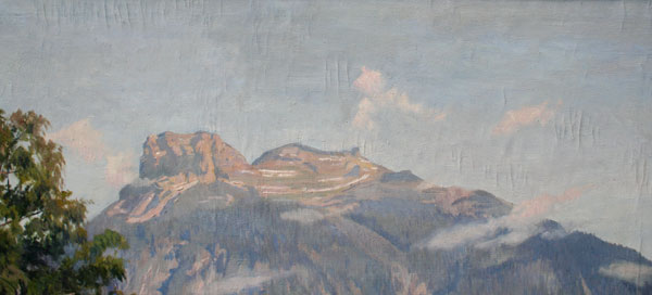 CONDITION: Stretched over board, not glued. There are scattered areas of vertical cracklure in the sky.