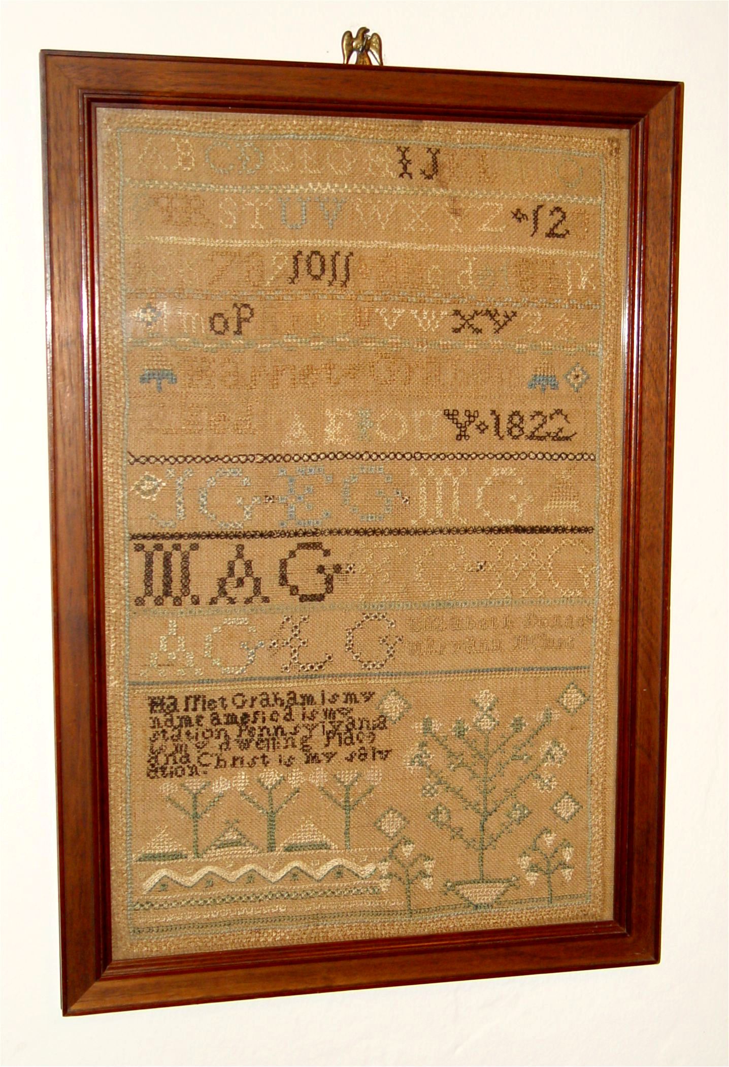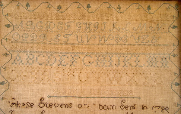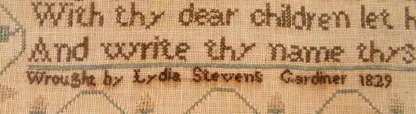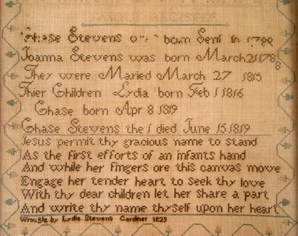 SAMPLER BY LYDIA STEVENS GARDINER 1829: Alphabet and family register stating the birth and 1815 marriage of Chase and Joanna Stevens, the births of children Lydia in 1815 and Chase 1819 and death of Chase in 1819. ''Jesus permit thy gracious name to stand / As the efforts of an infants hand / And while her fingers ore this canvas move / Engage her tender heart to seek thy love / With thy dear children let her share a part / And write thyself upon her heart''. Framed under glass. 23 1/2'' x 19 1/'' overall.