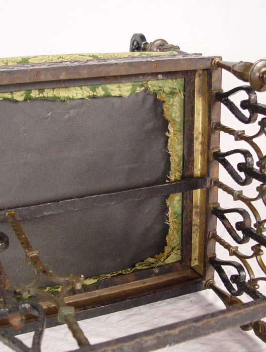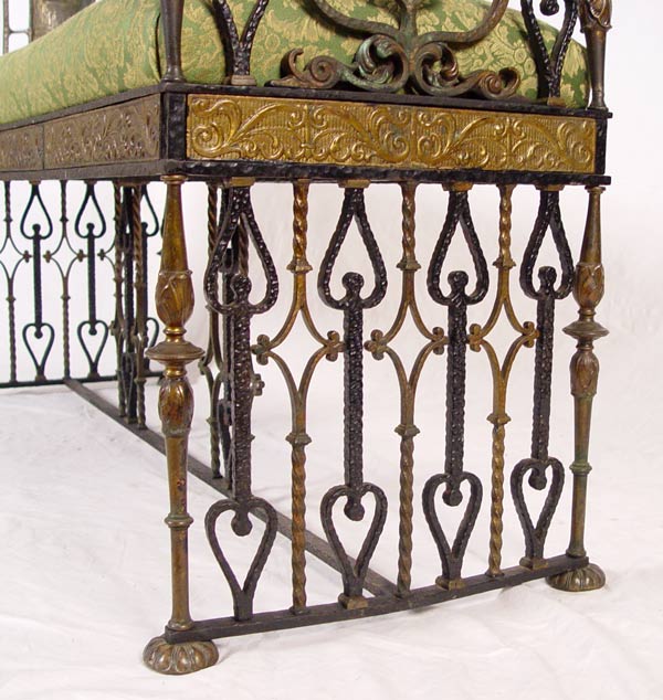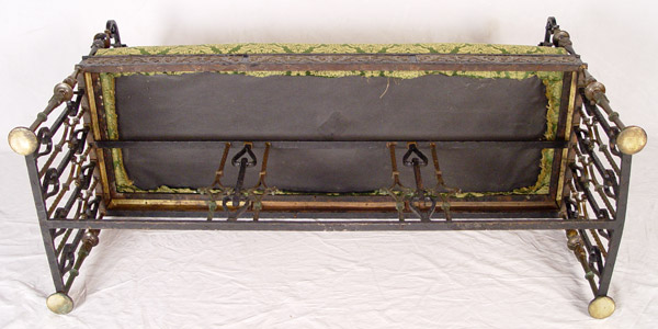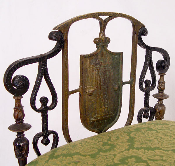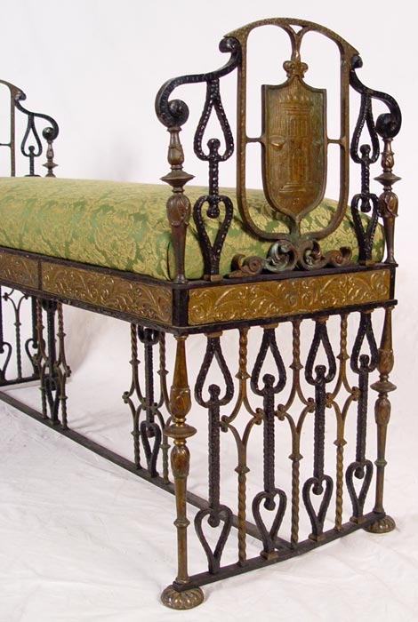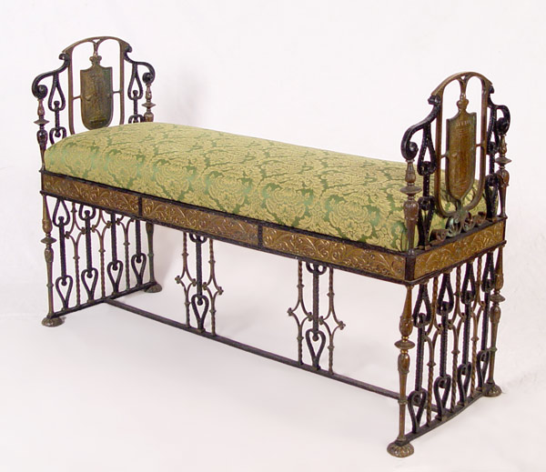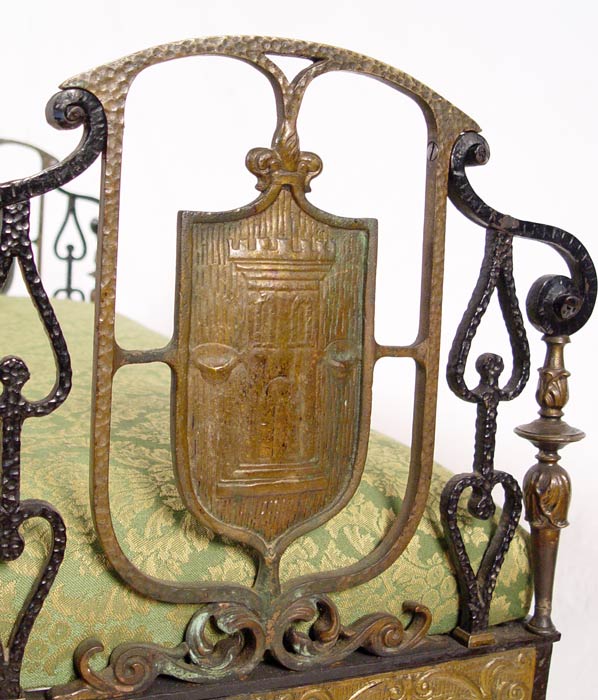 MIZNER BRONZE MOUNTED WROUGHT IRON BENCH: Oscar Bach quality, unsigned. Wrought iron with bronze accents including heraldic shield featuring castle. Green upholstered seat. Measures 31 1/2'' h. x 46'' x 16 1/4'' overall. Est. $3000/5000**