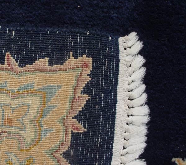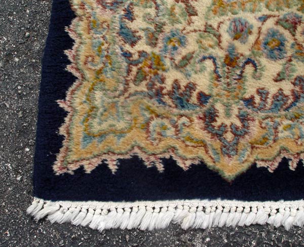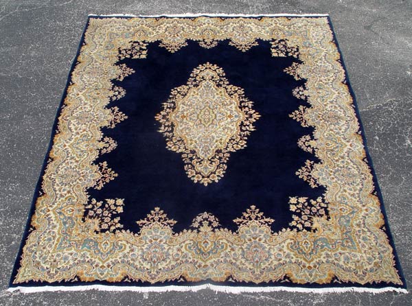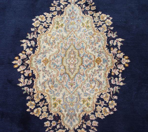 HAND TIED NAVY BLUE KERMAN CARPET: Approx 9' 9'' x 7' 10''. Wool pile on cotton foundation, open field medallion, approx. 169 knots per inch. Ca. 2nd quarter 20th C.