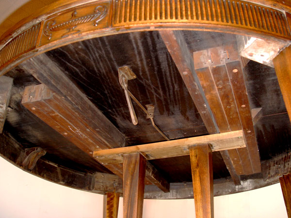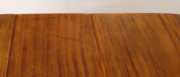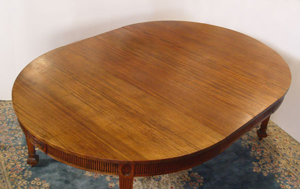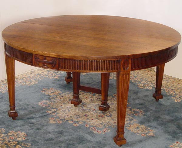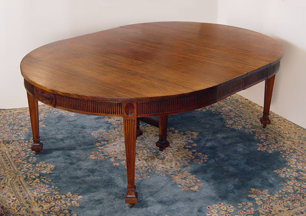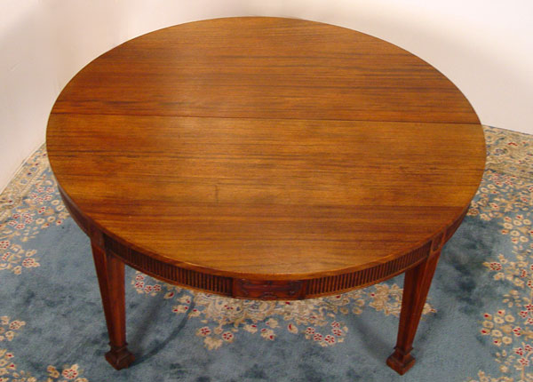 WATERTOWN SLIDE ROUND FEDERAL STYLE 5 FT ROUND DINING TABLE: Expandable mahogany round table with 2 leaves. Ribbed apron, Carved Grecian urns, reeded tapered legs ending in square pad feet and casters. 29 1/2'' H., 60'' dia, extends with two 12: leaves.