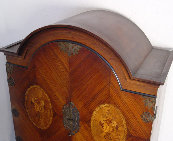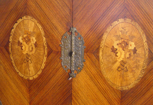 MARQUETRY INLAY SIDE CABINET: Marquetry flowers and inlaid geometric design. 2 doors over single full length drawer, shelves to the interior. Measures 71'' x 40 1/2'' x 20 1/4''