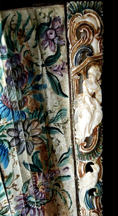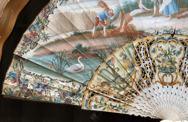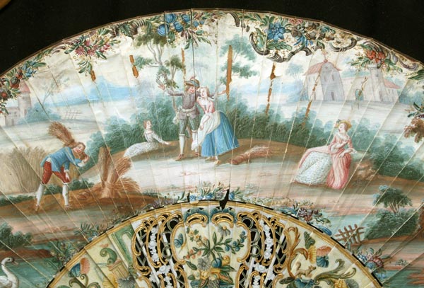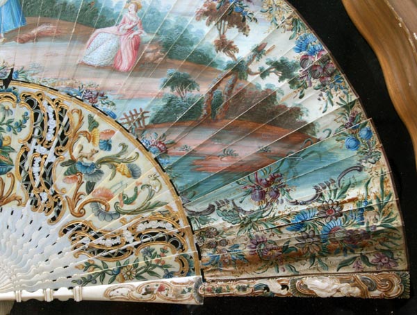 HAND PAINTED ITALIAN FAN: Fan is displayed in painted gilded and gessoed frame designed specifically for the fan. The fan depicts daily scenes in early 19th century Europe. Fan is 11'' x 21'', frame size of 16'' x 27''. Est. $500/800**