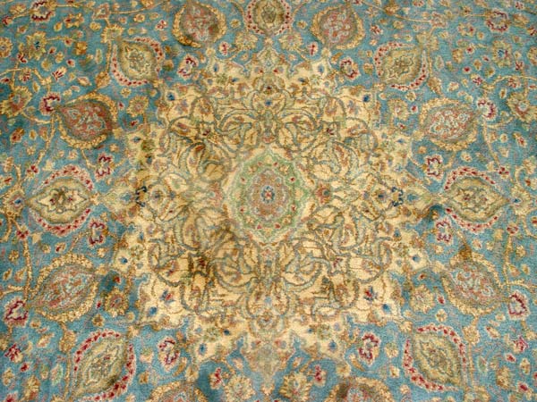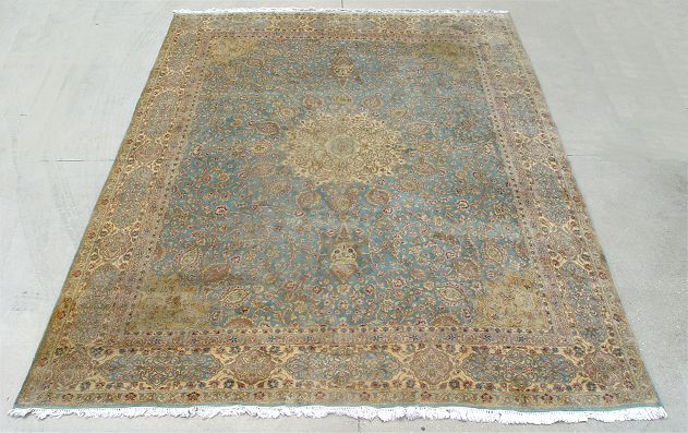 HAND TIED BLUE KERMAN CARPET: Approx 13' 10'' x 9' 10''. Large center medallion with multiple drop pendants. The field is covered with an all over arabesque design. Blue field, cream border. Ca. 2nd quarter of 20th C.