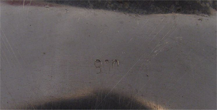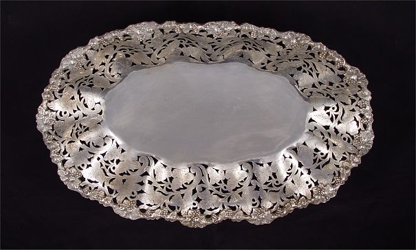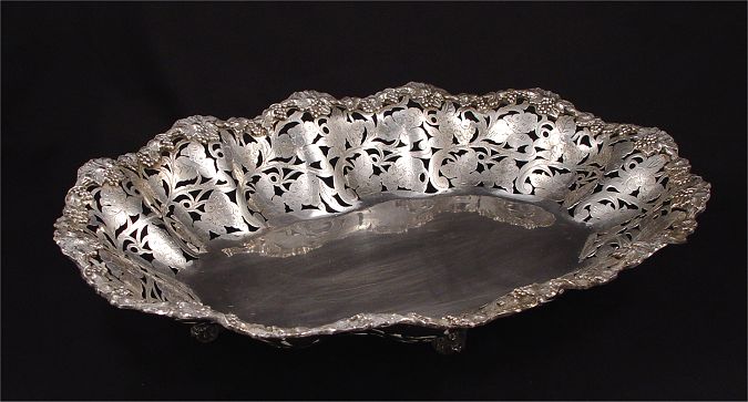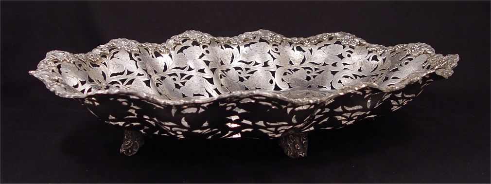800 SILVER RETICULATED FOOTED CENTERBOWL: Reticulated grapes and vine design with engraving. Embossed grape and vine design rim. On 4 feet. Simple 800 silver hallmark. 3 1/8'' h x 17'' x 11 1/2''. Approx. 37.8 troy oz.