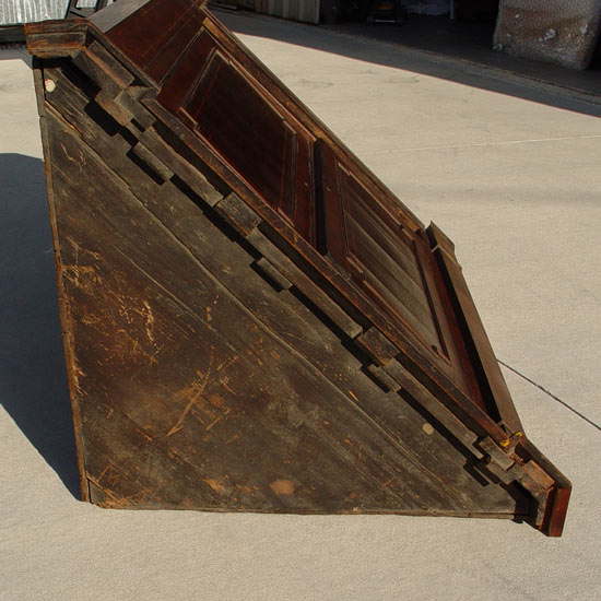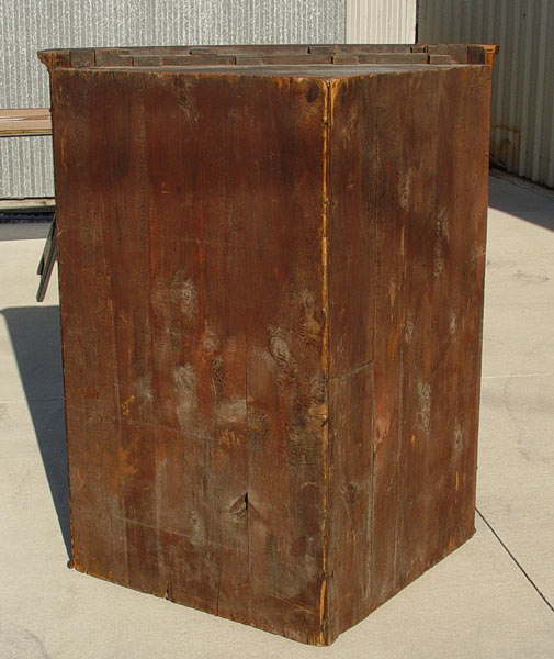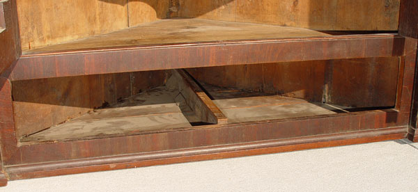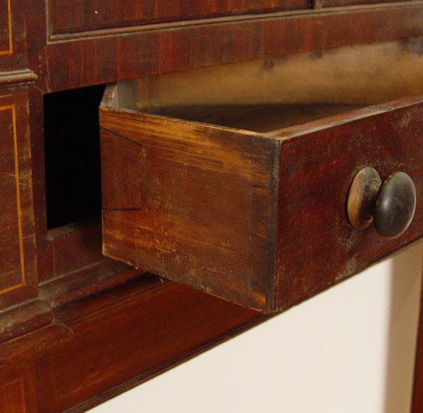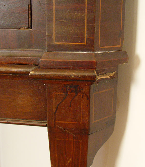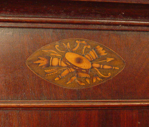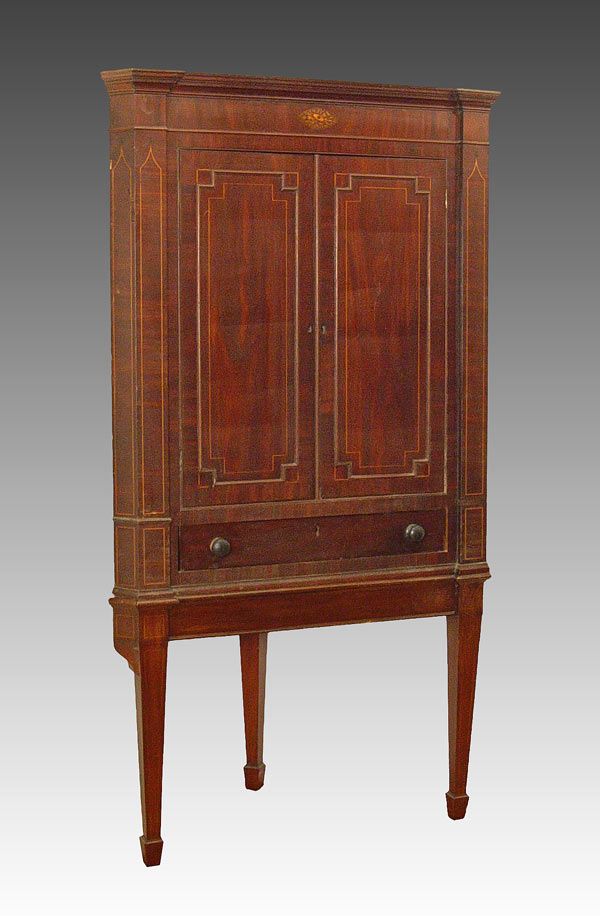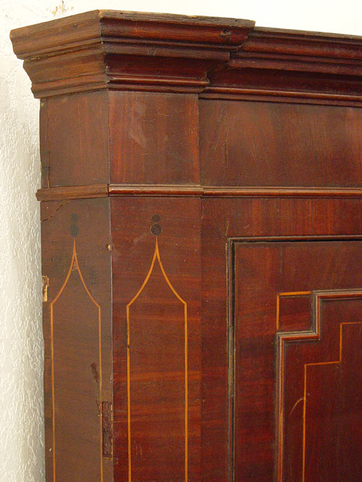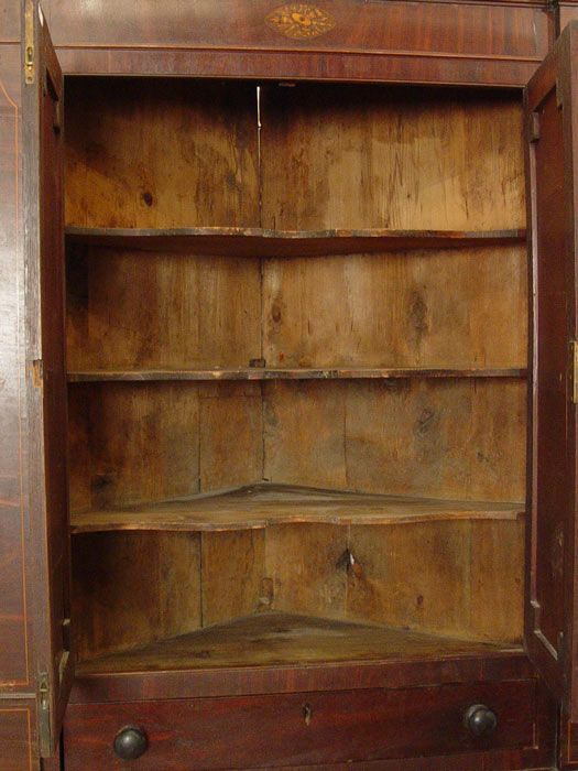 FEDERAL PERIOD NEW ENGLAND CORNER CABINET ON STAND: Mahogany veneer and string inlay decorated with inlaid quill and arrow medallion on the top. Overhanging cornice, interior shelves, exterior full length drawers. In as found condition with minor veneer loss. 77 1/2'' tall x 43 1/3'' wide x 20'' deep. Northshore New England.