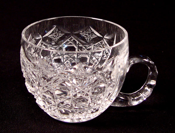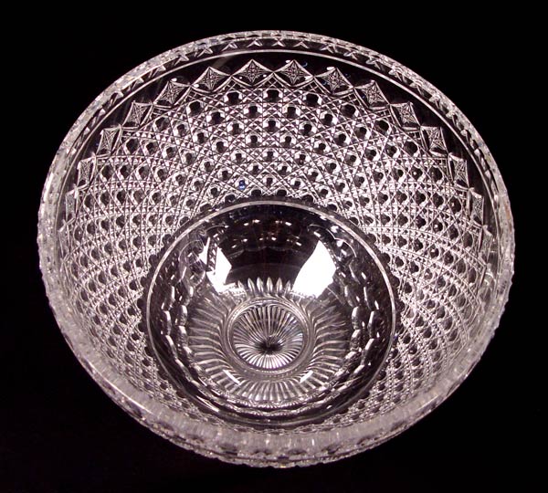 CUT GLASS PEDESTAL PUNCH BOWL & 12 CUPS: Cut in a caned pattern. The bowl is 11 1/2'' x 9 3/4''.